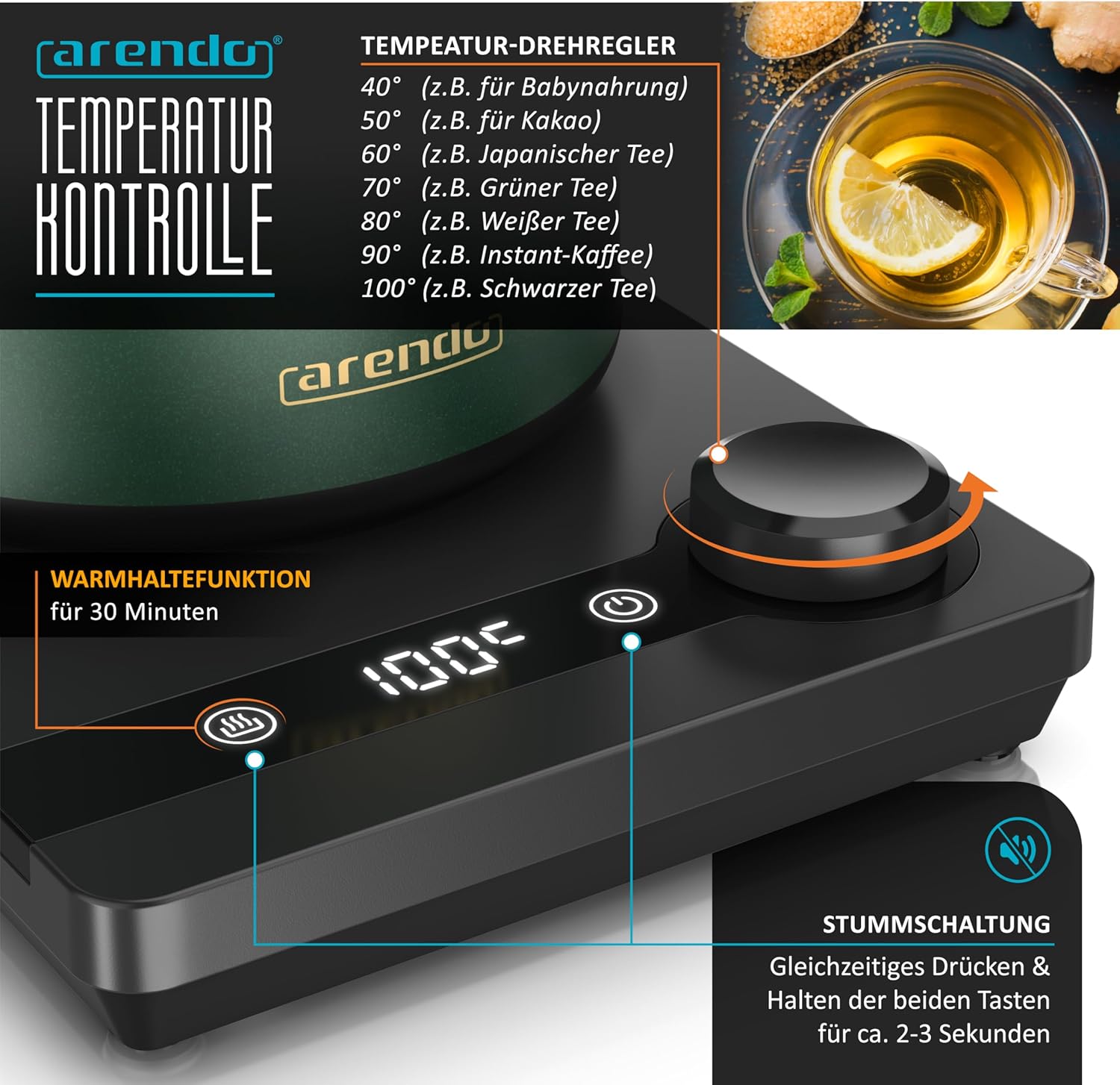 - AUSSTATTUNG: Wasserkocher MOCI, Fassungsvermögen: 0,6 Liter | Wählbare Temperaturen von 40° bis 100°C in 5°-Schritten | Warmhaltefunktion 30 Minuten | 360° Basisstation mit Multifunktionsregler (drehen und drücken): Temperatur wählen, Kochvorgang