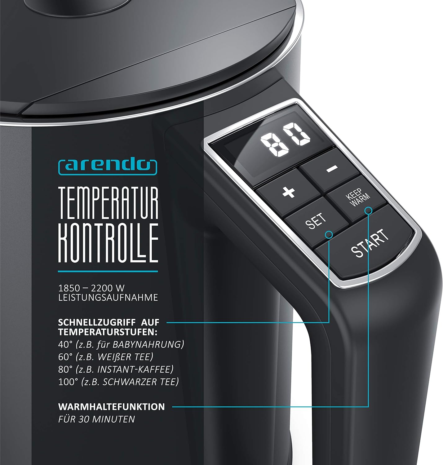 - Mit der Warmhaltefunktion wird die eingestellte Temperatur über 30 Minuten gehalten: Sie können Ihr Getränk in aller Ruhe geniessen und dann nachfüllen