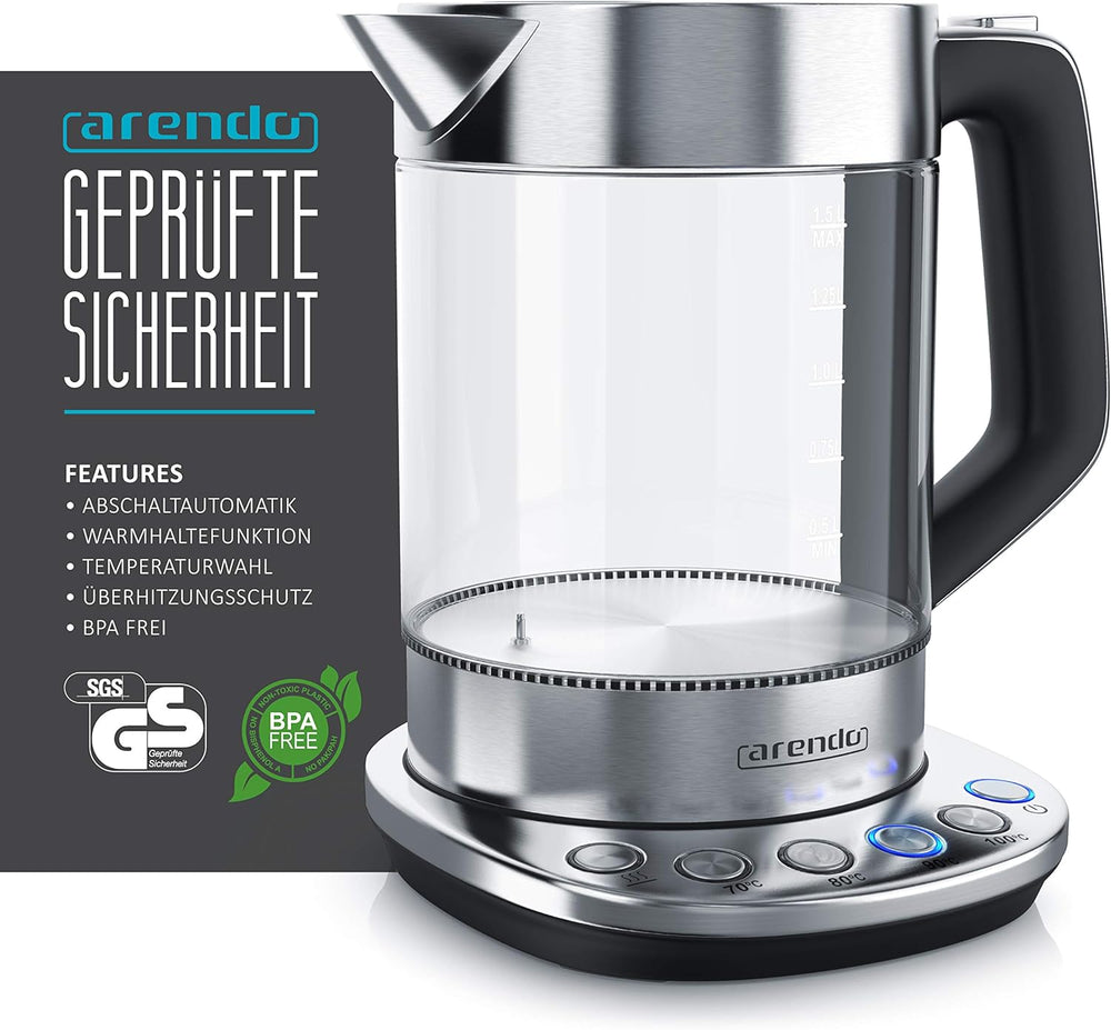 - Mit seinen leistungsstarken 2200 Watt erhitzt der Arendo Glaswasserkocher grosse Wassermengen in kurzer Zeit und hält sie über die Warmhaltetaste bis zu 30 Minuten auf Temperatur. So können Sie Ihren Kaffee und Tee in aller Ruhe geniessen. Für einen