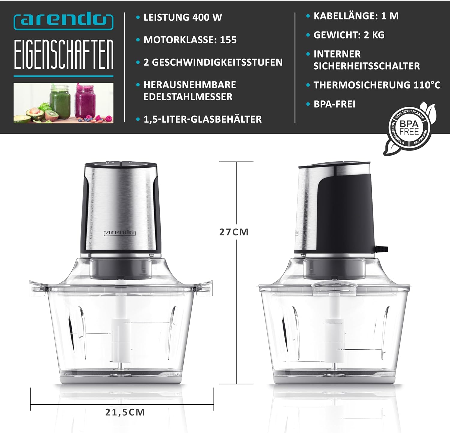 - Glas statt Kunststoff: Das Gerät zerkleinert die Lebensmittel in seinem 1,5-Liter grossen Glasbehälter. Das ist so gesund und langlebig, wie es sein soll.
