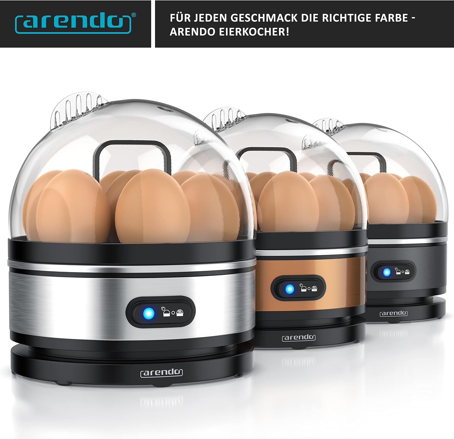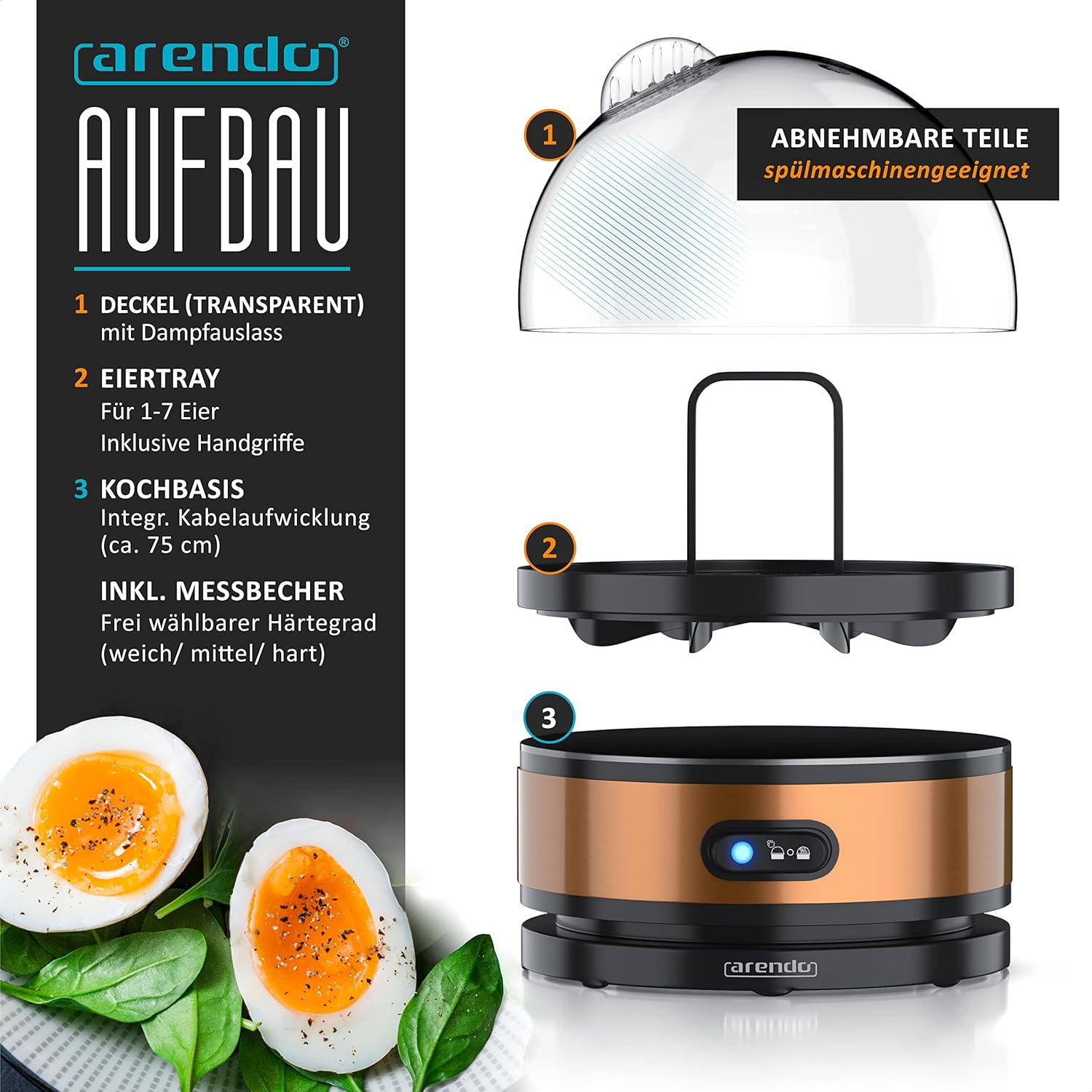 • LIEFERUMFANG: Arendo Sevencook Edelstahl Eierkocher (mit Kocheinsatz, transparentem Deckel mit Dampfauslass, Messbecher + Eierstecher) + Bedienungsanleitung