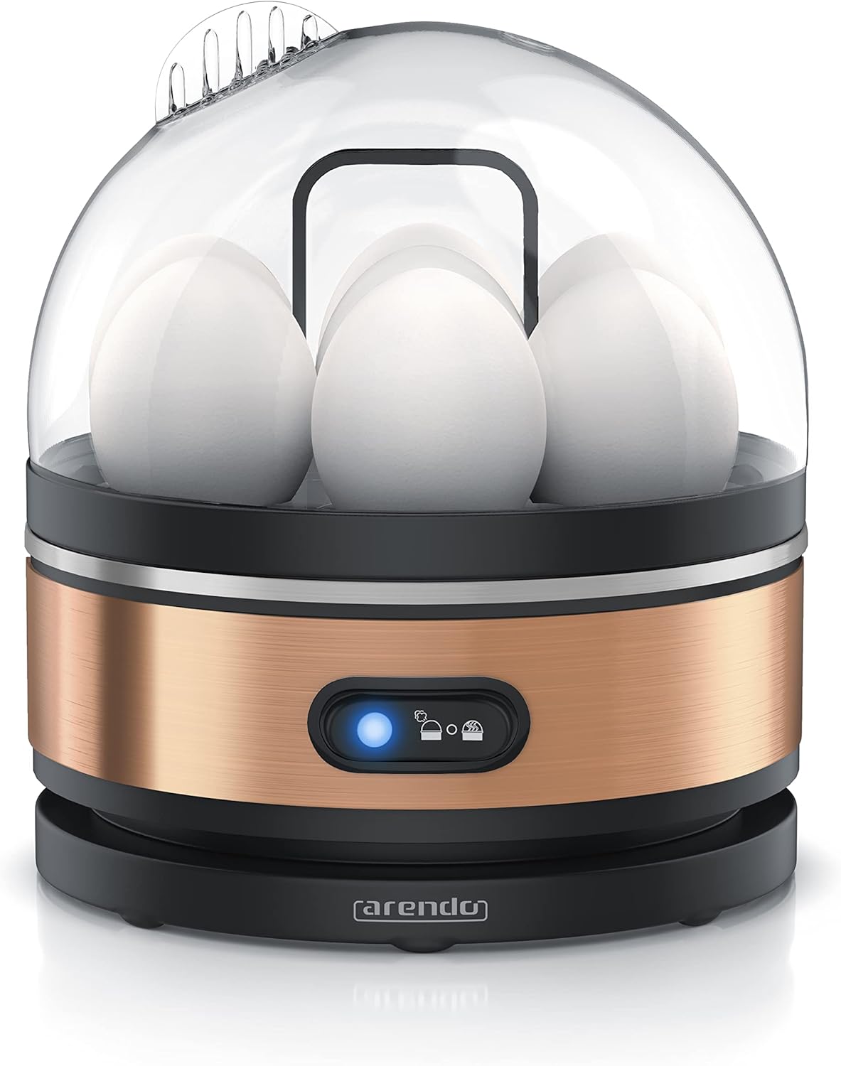• FEATURES: Härtegrad individuell anpassbar (weich/mittel/hart) | geeignet für bis zu 7 Eier | Kippschalter mit 3 Funktionen: Kochmodus (blaue Indikationsleuchte; Signalton bei Beendigung); AUS; Warmhaltemodus | Kocheinsatz mit Handgriff zum leichten