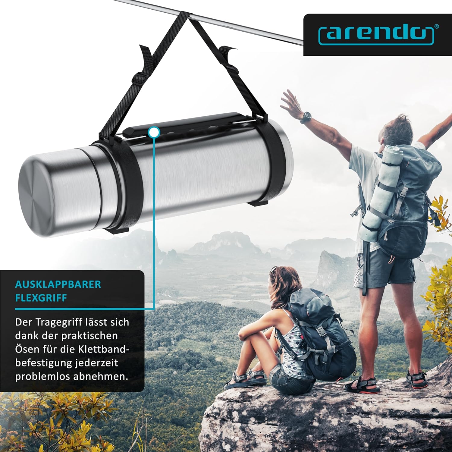 - PRODUKTEIGENSCHAFTEN: Thermoskanne 1000 ml mit doppelwandiger Isolierung | 2 ineinander gesteckte Becher als Deckel | platzsparender Flexgriff seitlich am Gehäuse | Edelstahl, massiv, Spülmaschinen-geeignet | Ösen für Klettbandbefestigung |
