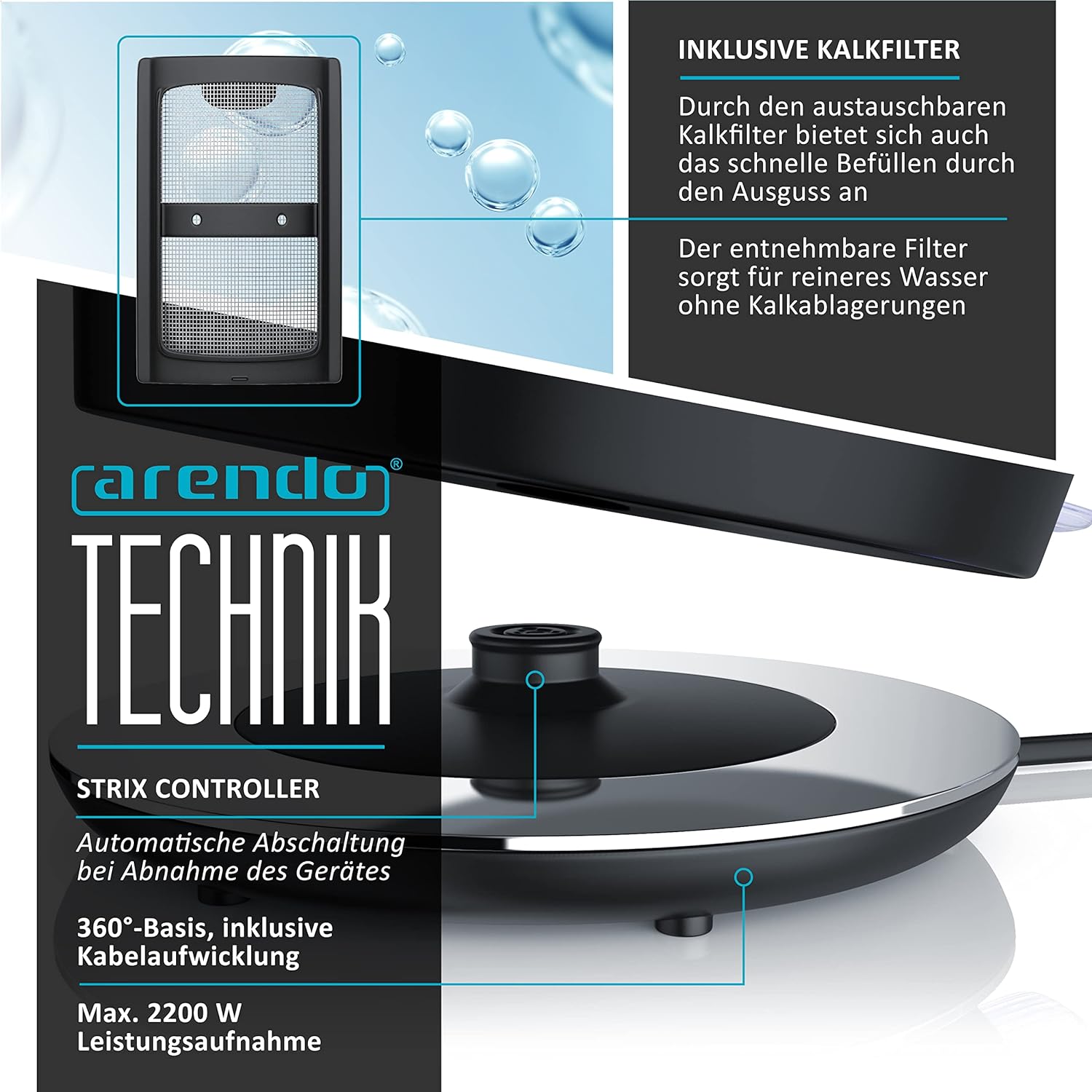 - Strix-Controller (Schutzmechanismus gewährleistet, dass eine automatische Abschaltung bei Abnahme des Gerätes garantiert ist) | kabellos (Kessel von Station abnehmbar) | Power-Schalter (blaue LED) | mit aussen liegender Wasserstandsanzeige (leicht ablesbar) | Steckertyp: Schuko