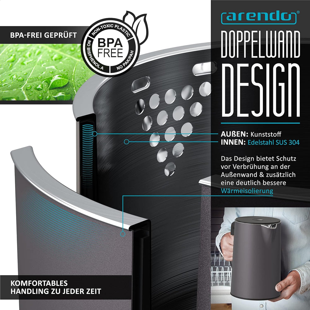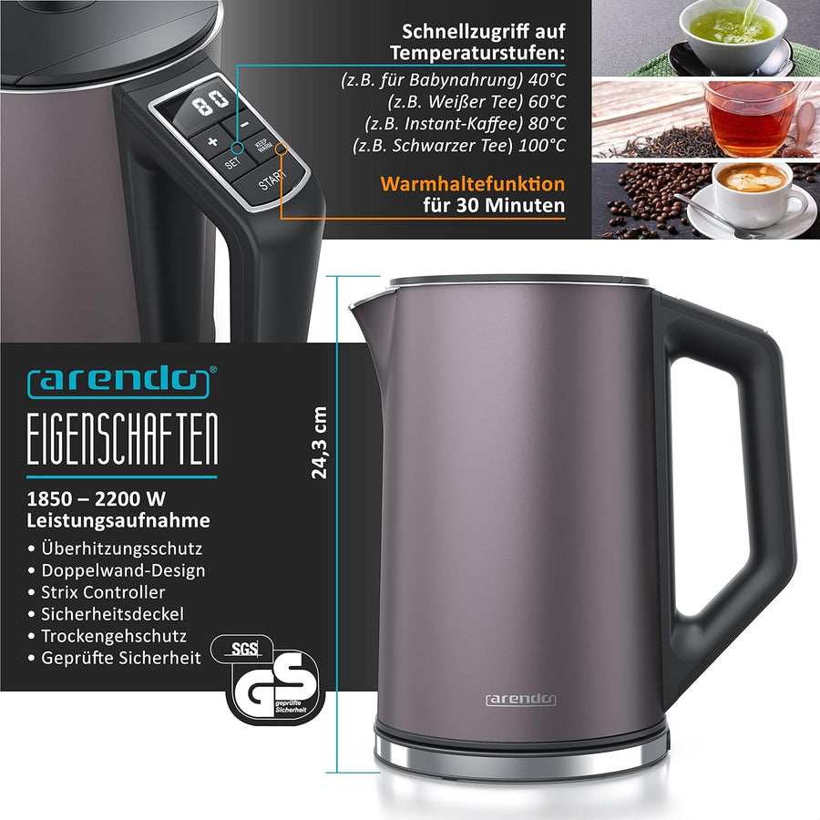 - DER WASSERKOCHER ELEGANT (2000 W) stellt bei unseren Kunden täglich seine Qualität unter Beweis. Gefertigt aus lebensmittelechtem SUS/SAE304 Edelstahl im Doppelwanddesign. | Füllmenge bis zu 1,5 Liter mit interner Füllstandsanzeige | Temperaturwahl von 40°C - 100°C (5-Grad-Schritte) | 30 min. Warmhaltefunktion | Trockengehschutz + Überhitzungsschutz | frei von BPA und Mikroplastikpartikeln | GS-Geprüfte Sicherheit | Abmessungen: Höhe: 24,5 cm x Breite: 22 cm (mit Griff), 15,2 cm (ohne).