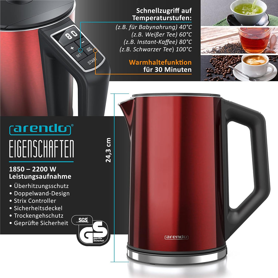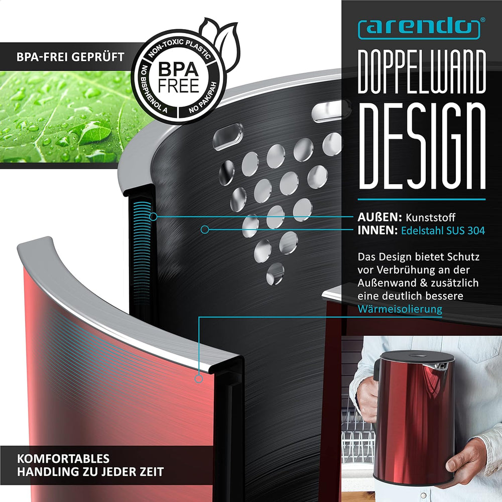 - DER WASSERKOCHER ELEGANT (2000 W) stellt bei unseren Kunden täglich seine Qualität unter Beweis. Gefertigt aus lebensmittelechtem SUS/SAE304 Edelstahl im Doppelwanddesign. | Füllmenge bis zu 1,5 Liter mit interner Füllstandsanzeige | Temperaturwahl