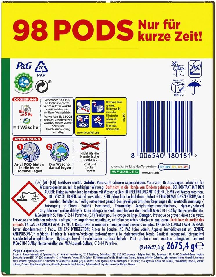Ariel Waschmittel Pods All-in-1, 98 Waschladungen (2 x 49) Universal Frischer Wäscheduft und strahle