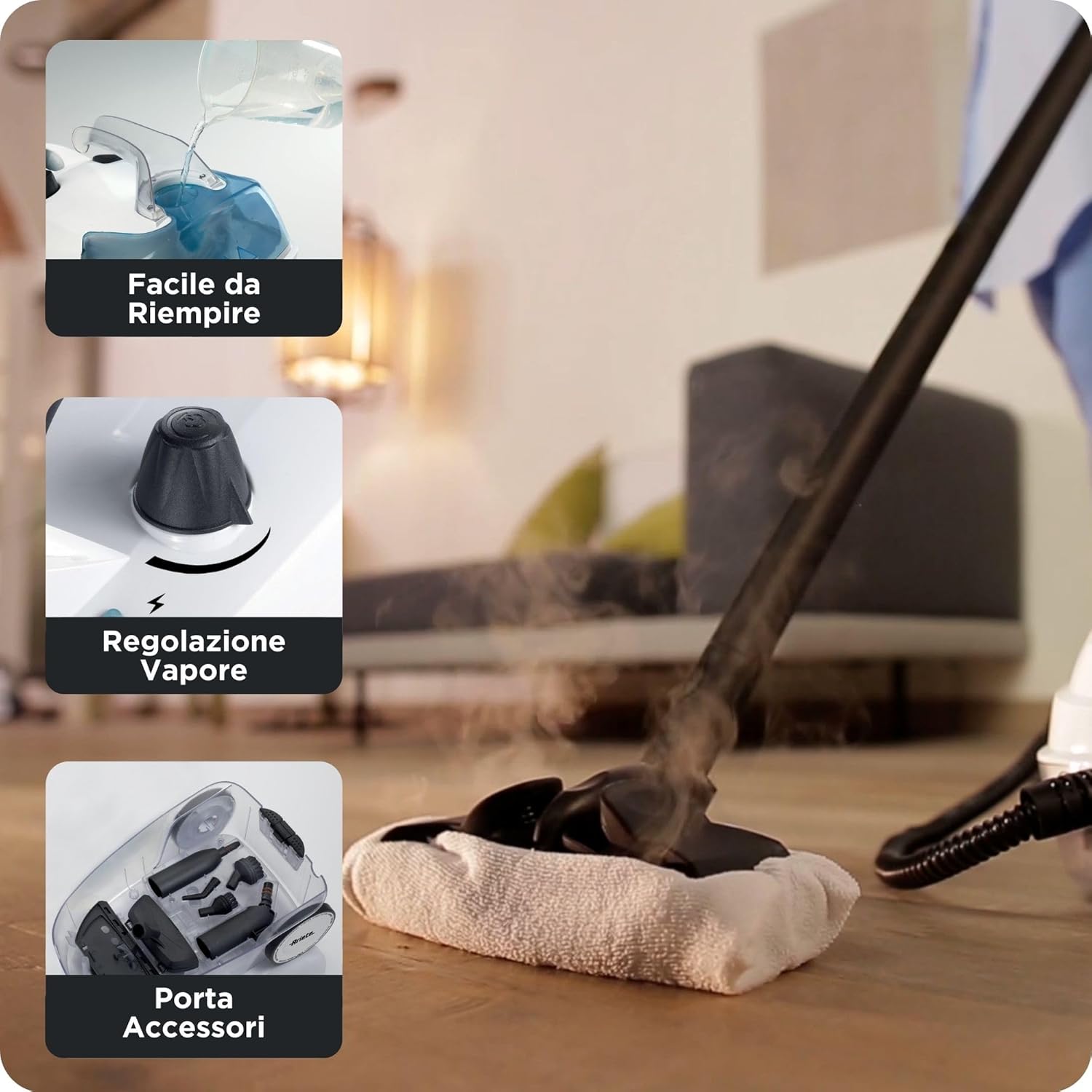 • Tadellose Sauberkeit: Dank einer Leistung von 1500 W ist der Dampf in kürzester Zeit einsatzbereit Der Druck von 5 bar gewährleistet eine konstante Aufrechterhaltung des Dampfstrahls für eine gründliche und wirksame Reinigung