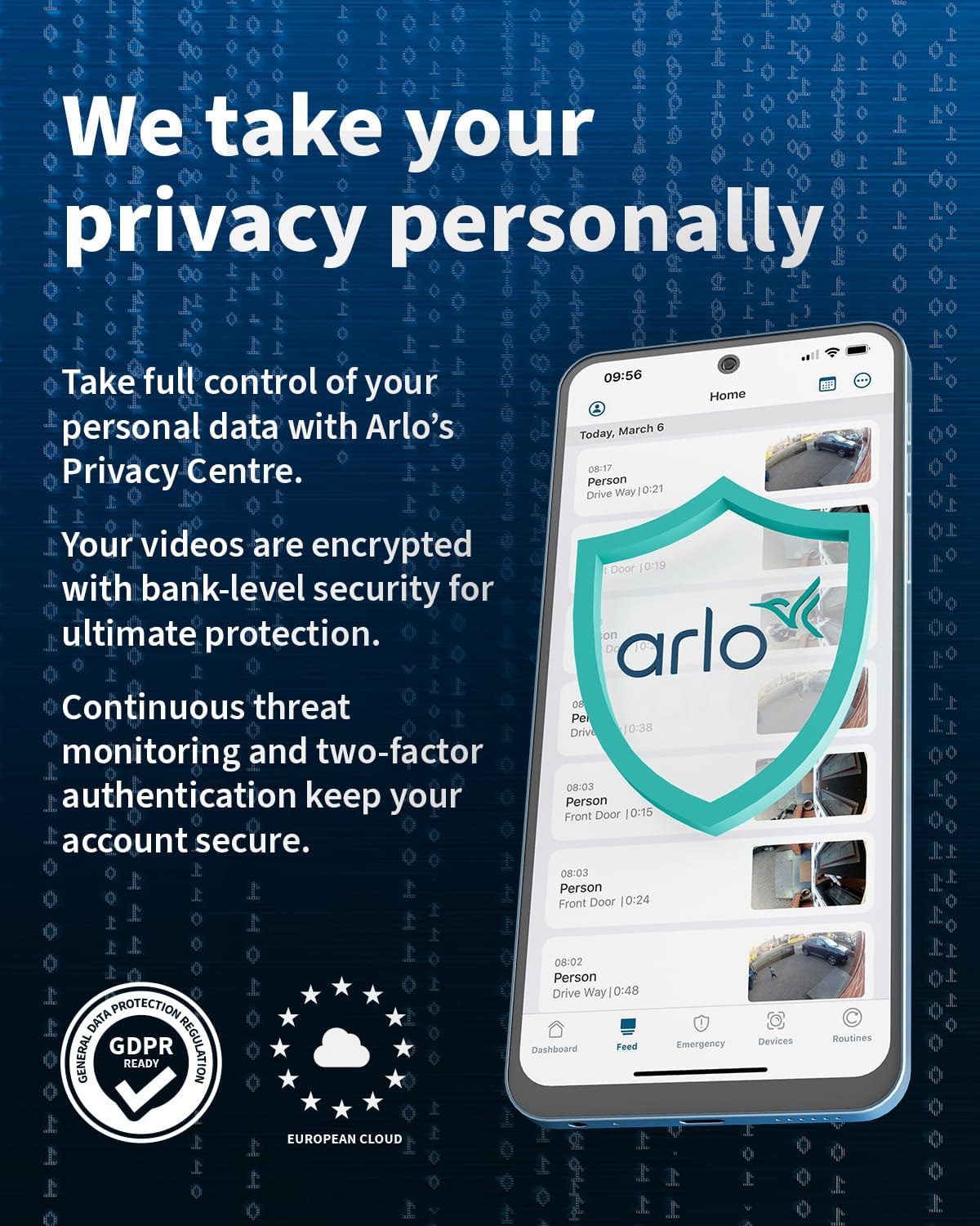 - ARLO SECURE SERVICEPLAN (separat erhältlich) sichert die Videos sicher in der Cloud. Erkennt mehr als jede andere Kamera; identifiziert und unterscheidet zwischen Personen, Autos, Haustieren und Paketen; ermöglicht Aktivitätszonen. Das Abonnement