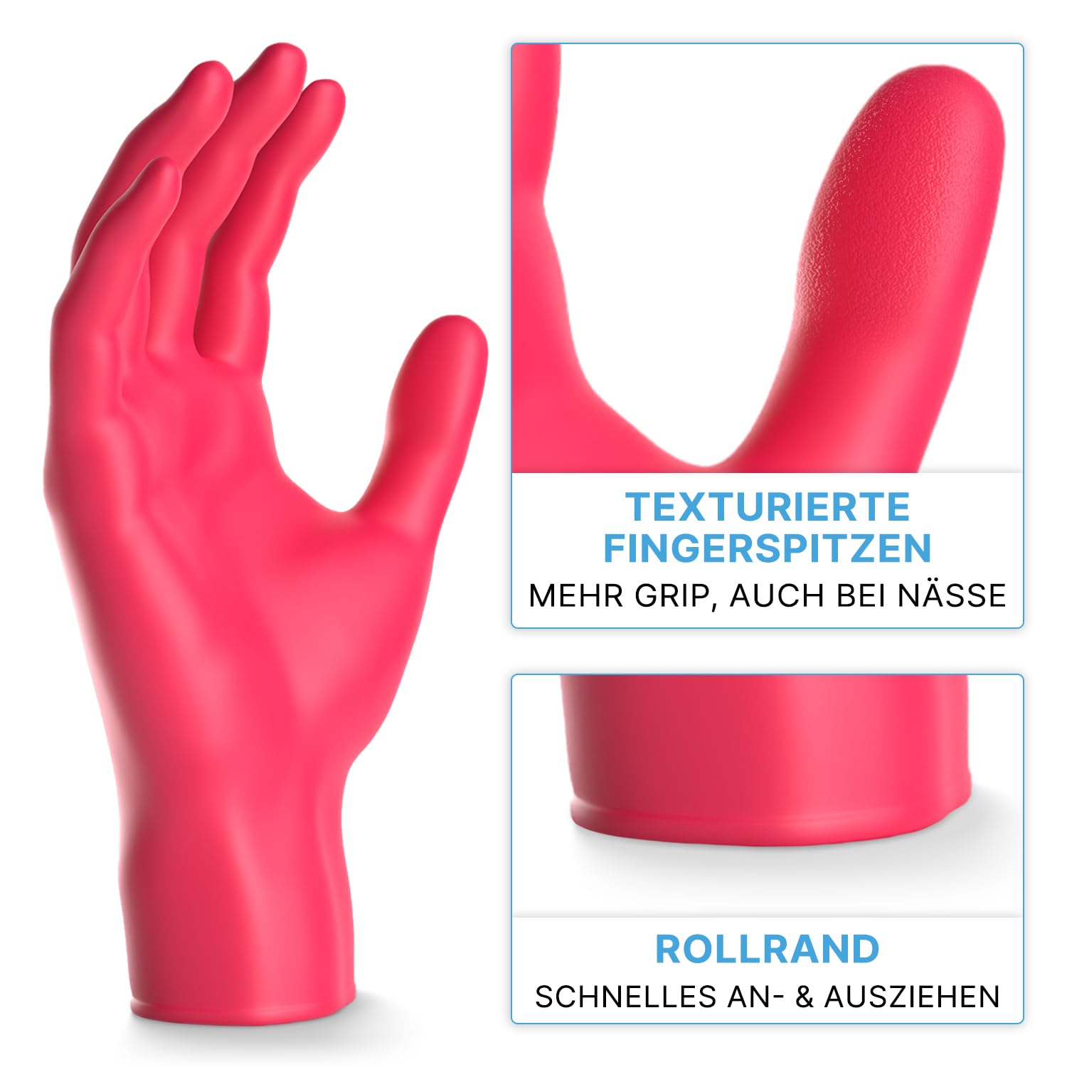 - ZUVERLÄSSIGER SCHUTZ ✓ Diese roten Nitrilhandschuhe erfüllen höchste Standards (EN 455 & EN 374) und bieten Schutz vor Viren, Chemikalien & Co. - ob für Hygiene- & Reinigungsarbeiten zuhause oder im professionell medizinischen Bereich!