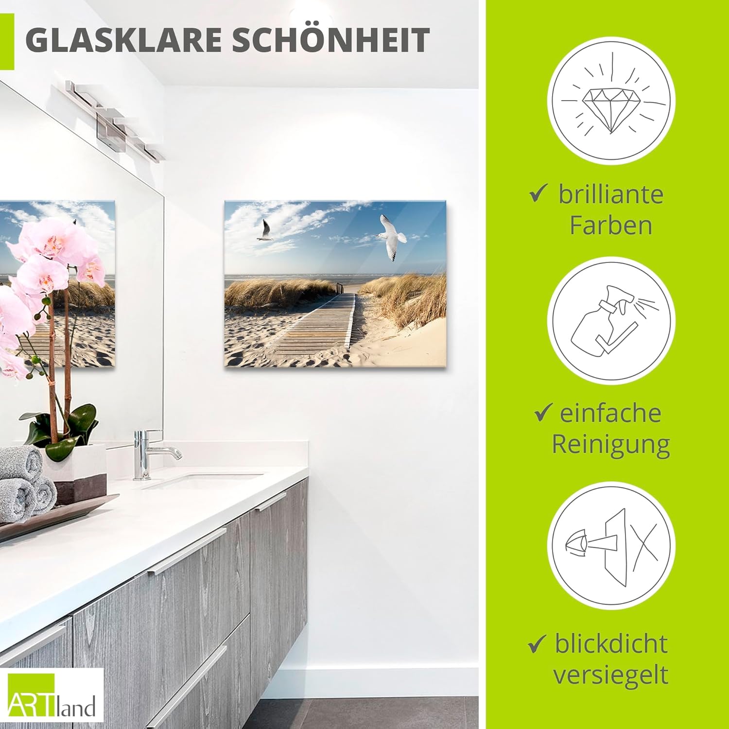 - VERWENDUNG: Unsere Glasbilder aus 4 mm Sicherheitsglas (ESG) geeignet sich für alle Wände in Wohnzimmer, Schlafzimmer, Esszimmer, Flur, Küche und Bad - Direkt fertig zum Aufhängen geliefert
