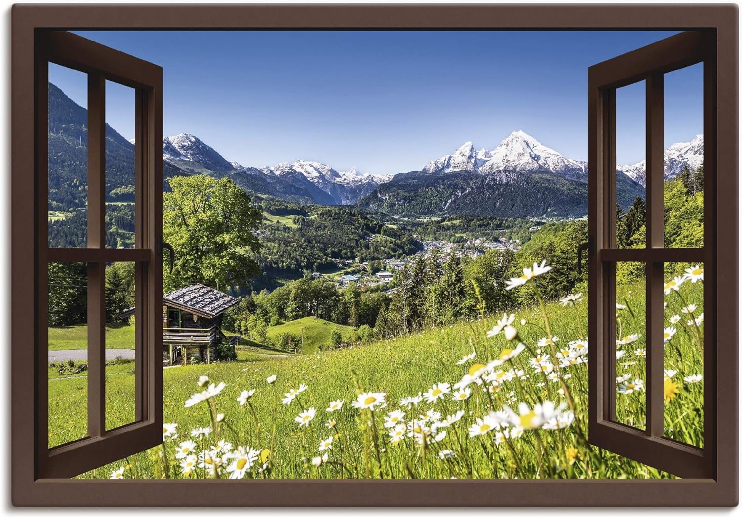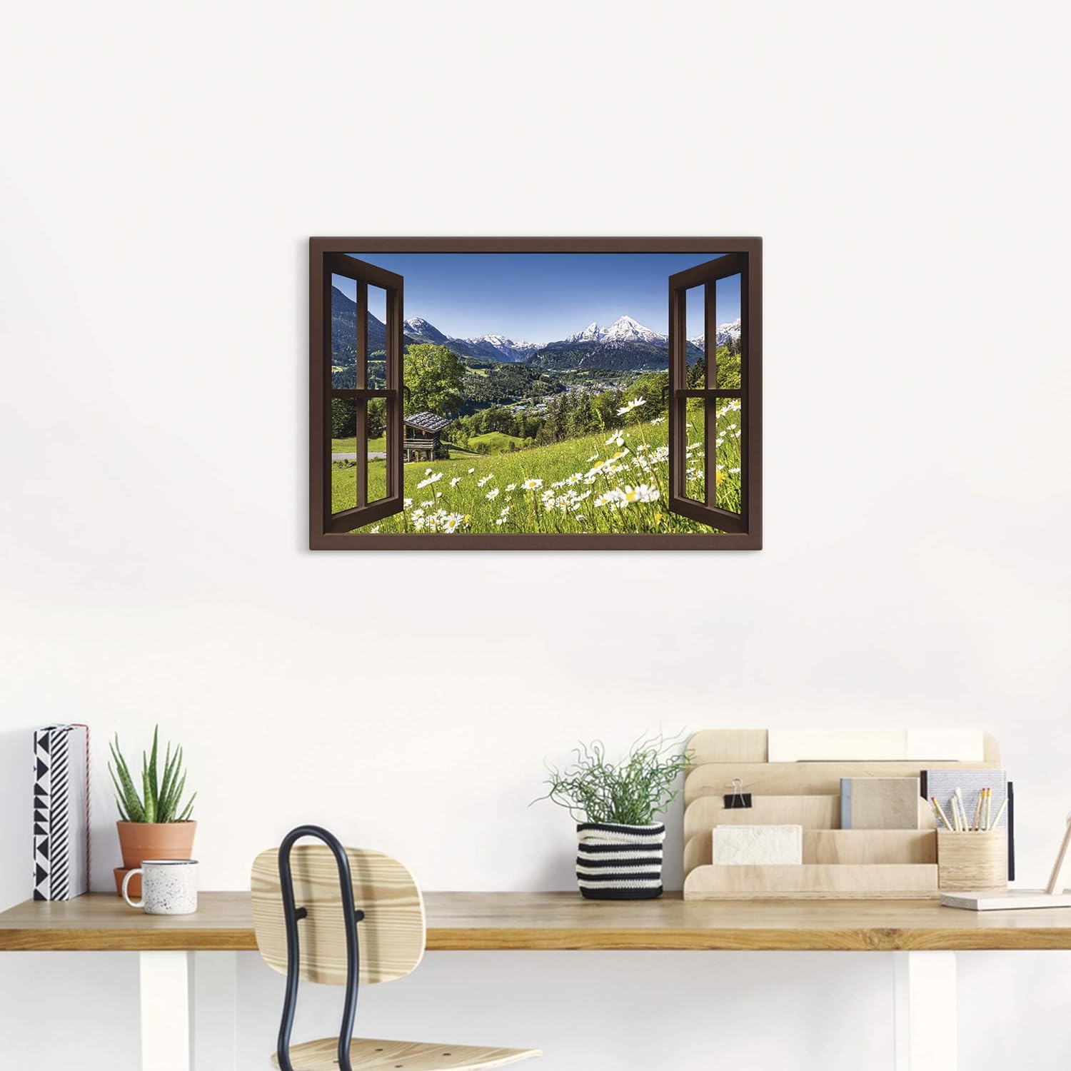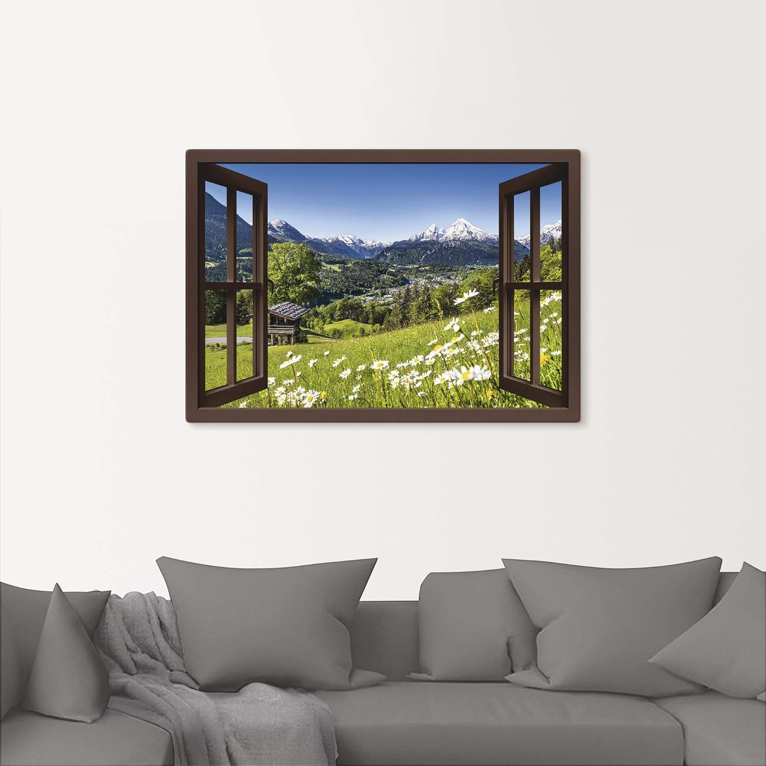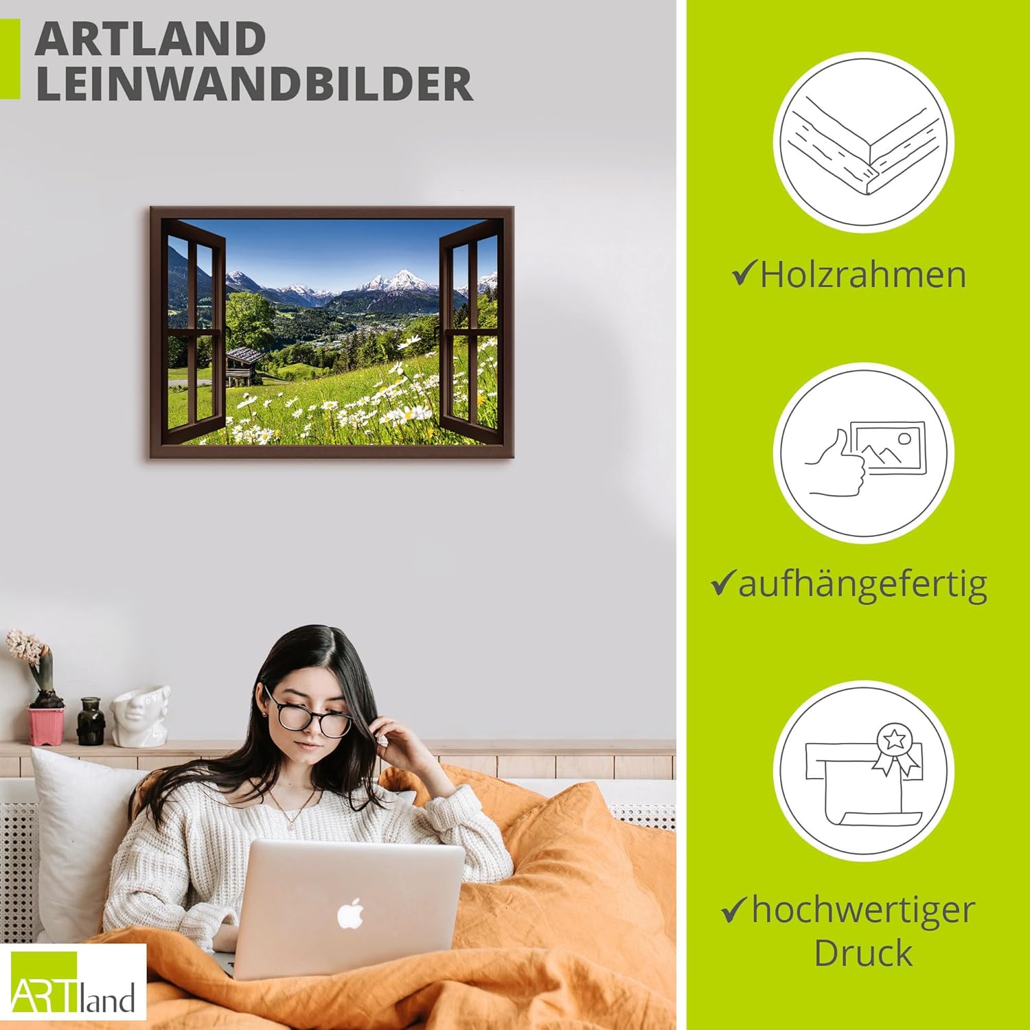Artland Leinwandbild Wandbild Bild auf Leinwand 70x50 cm Wanddeko Fensterblick Fenster Alpen Landsch