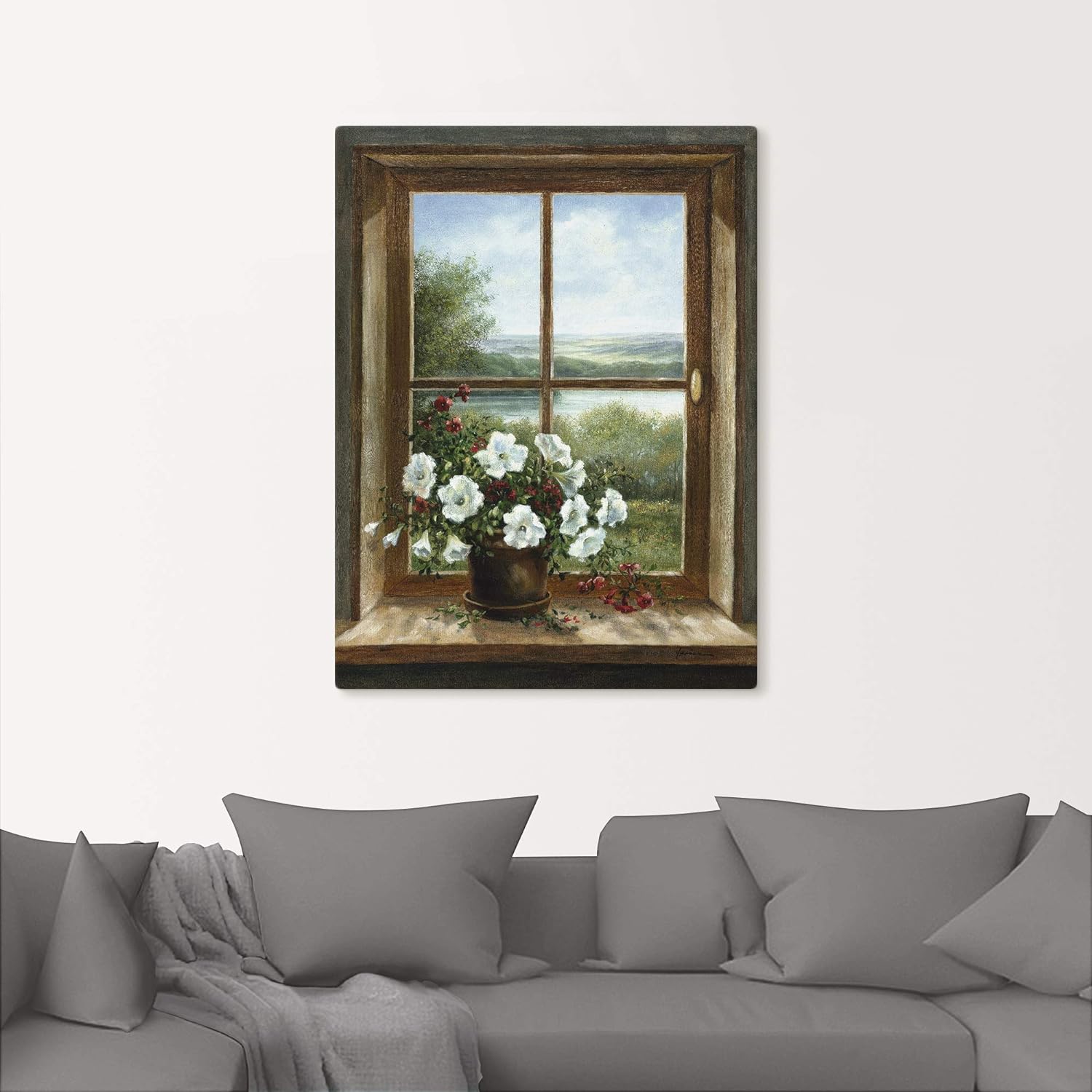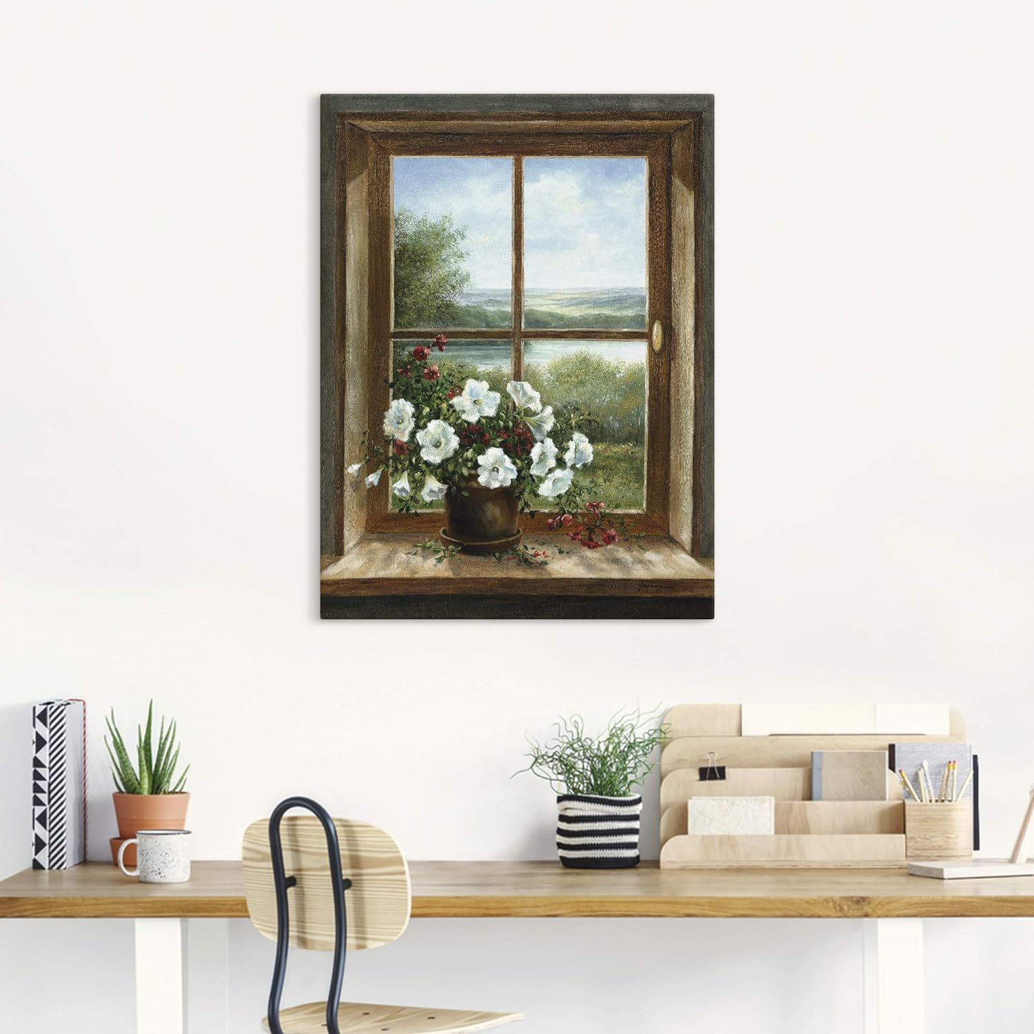 Artland Leinwandbild Wandbild Bild auf Leinwand 90x120 cm Wanddeko Fensterblick Blumen Fenster Lands