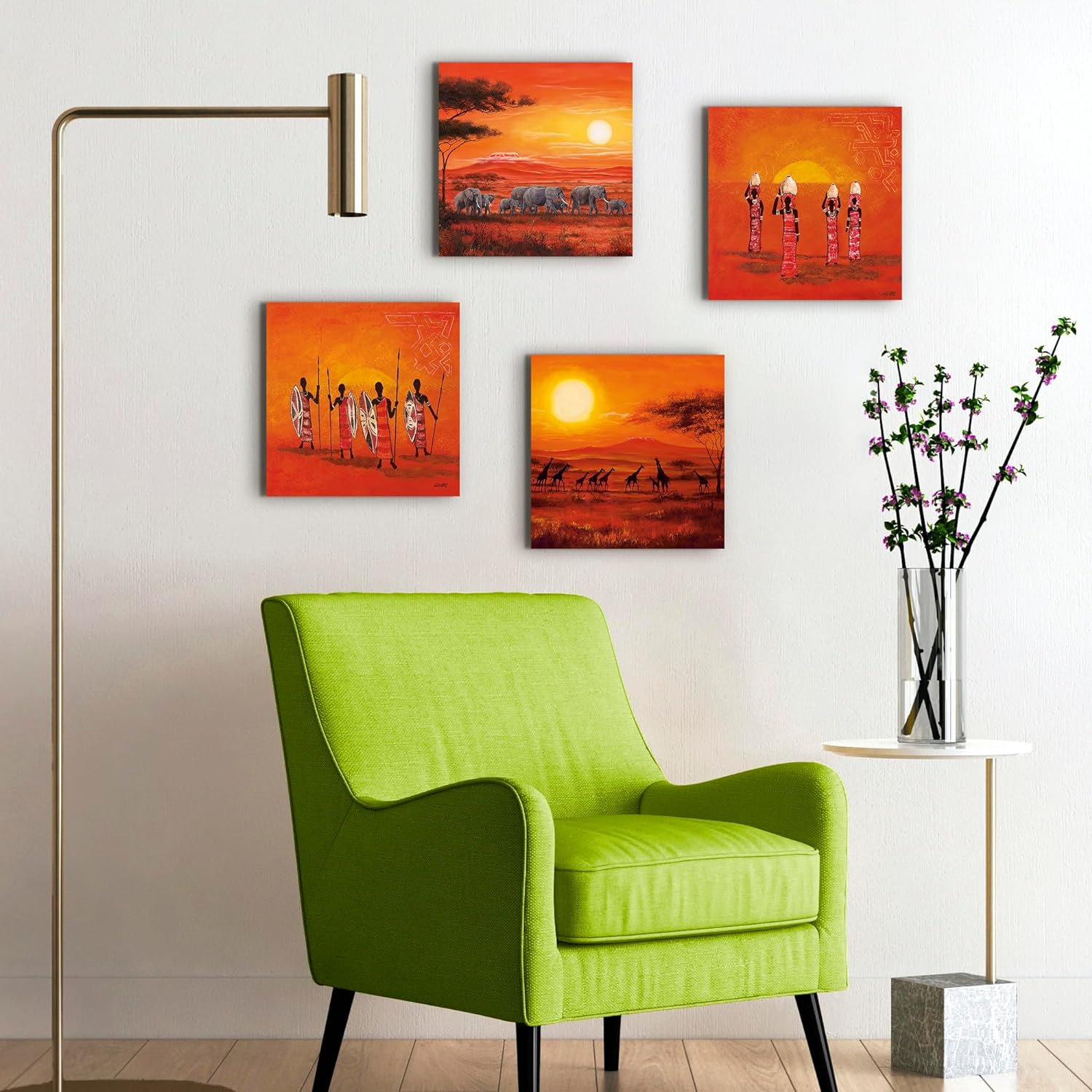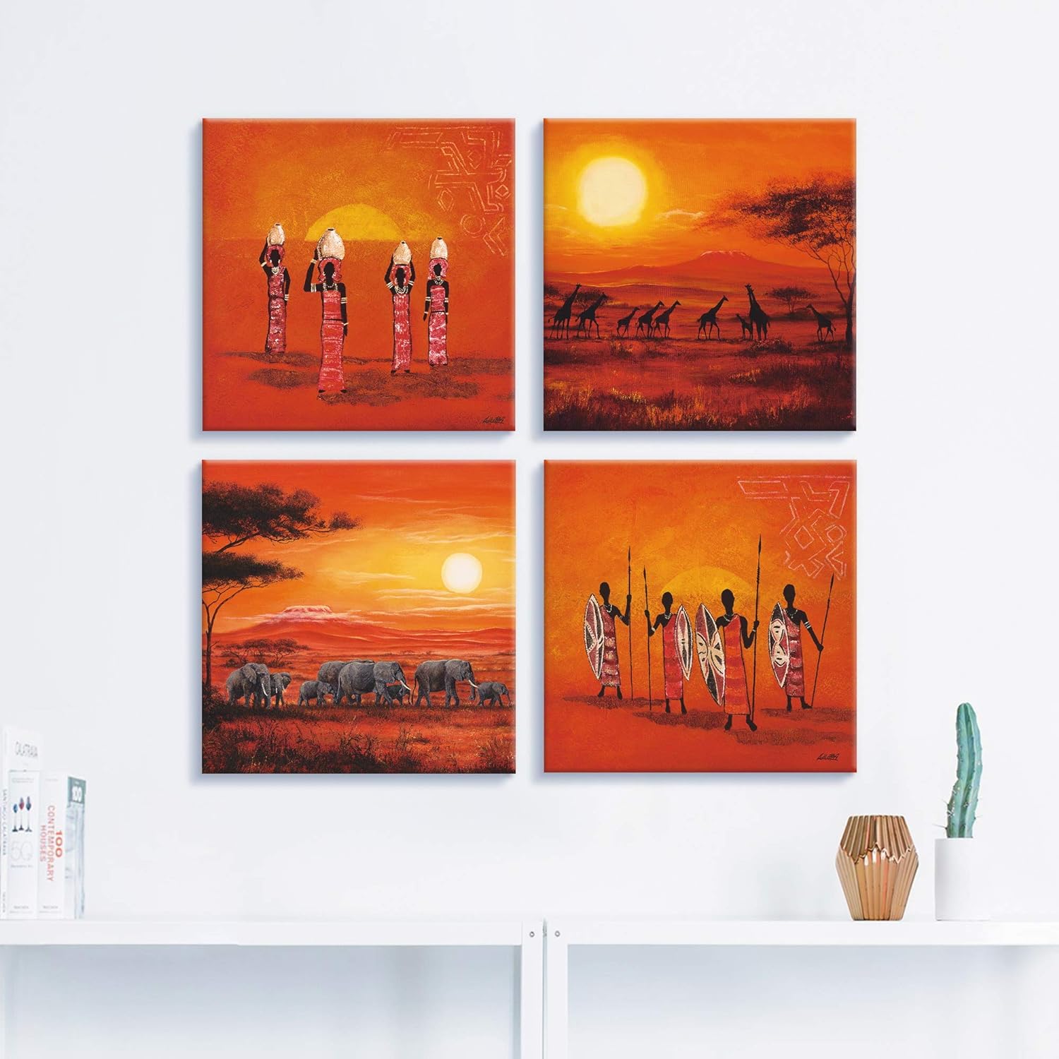 ARTLAND Leinwandbilder auf Holz Wandbild Bild Set 4 teilig je 30x30 cm Afrika Safari Landschaft Elef