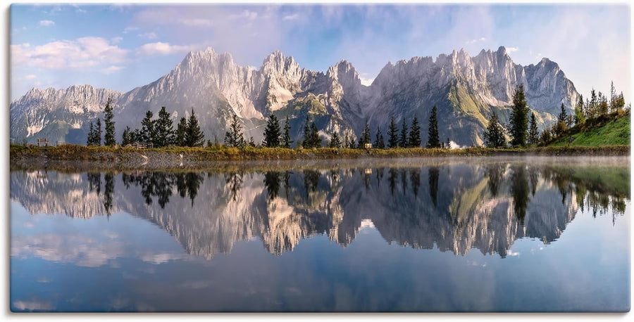 ARTland Leinwandbilder Wandbild Bild auf Leinwand 60x30 cm Wanddeko Landschaft Berge Alpen Bäume See