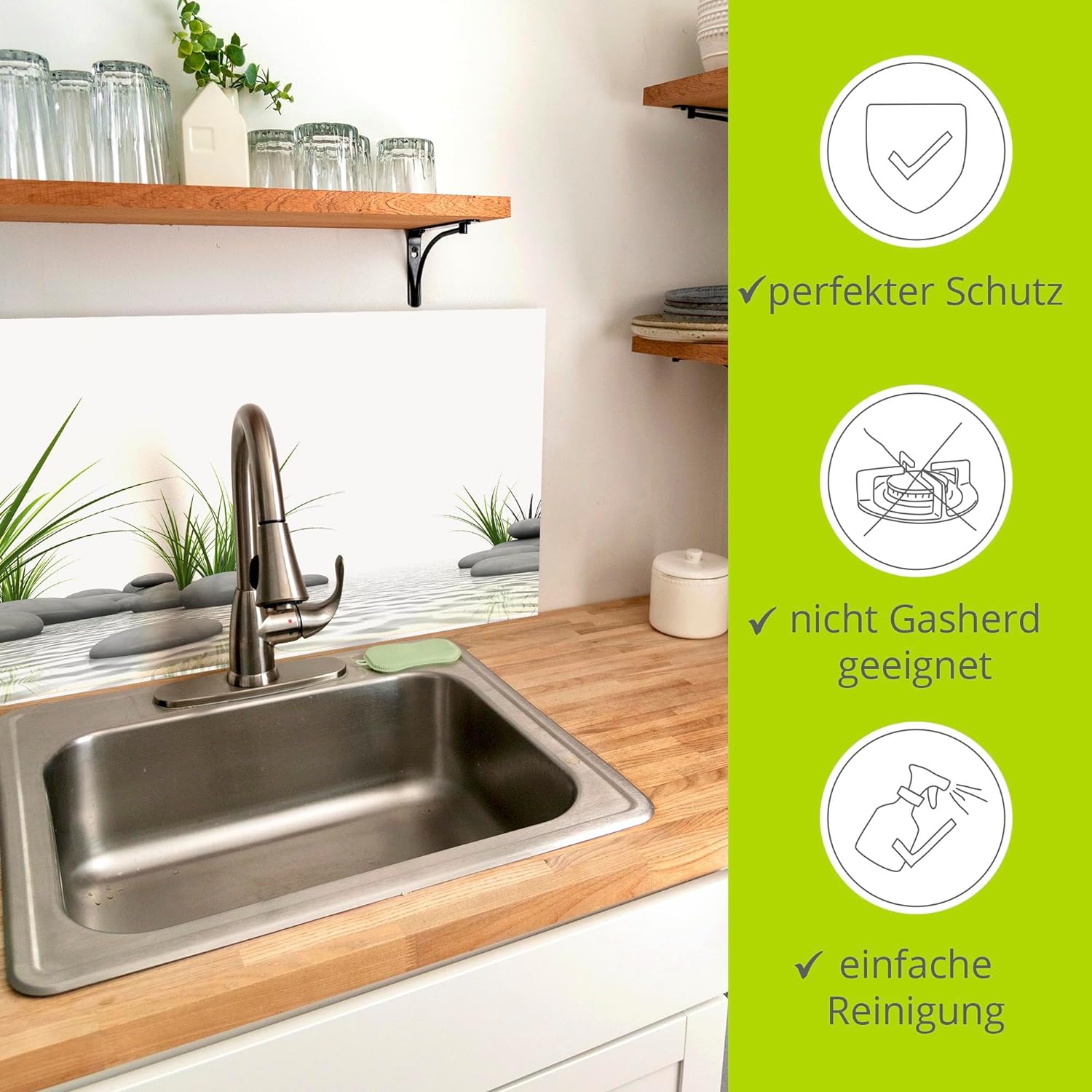 - MONTAGE: Der Küchenspritzschutz ist rückseitig mit einem Spezialklebeband ausgestatttet, sodass Sie die Rückwand in wenigen Schritten anbringen können. Wir empfehlen Ihnen die Kanten nach Ankleben ringsrum mit Silikon zu versiegeln