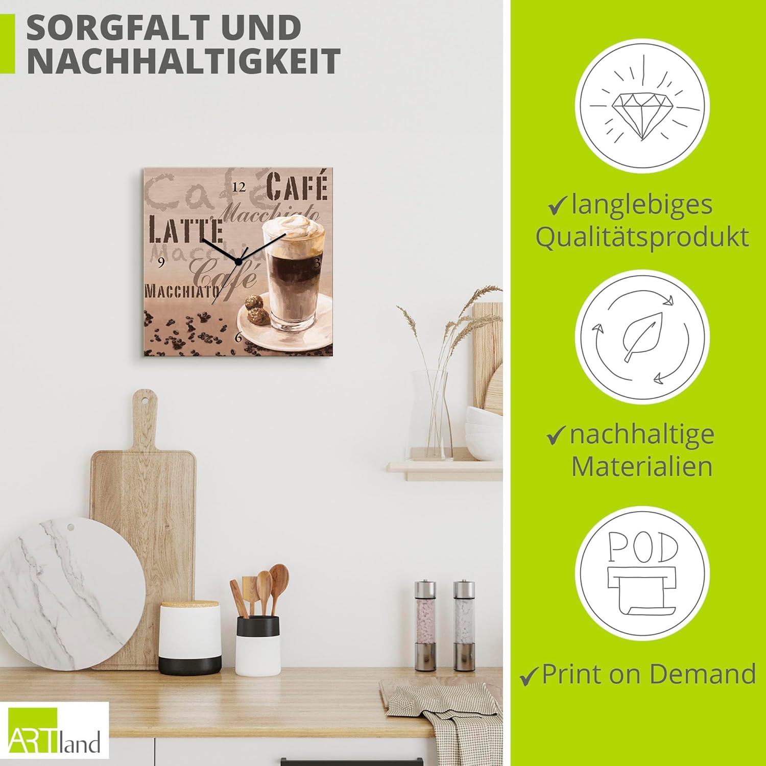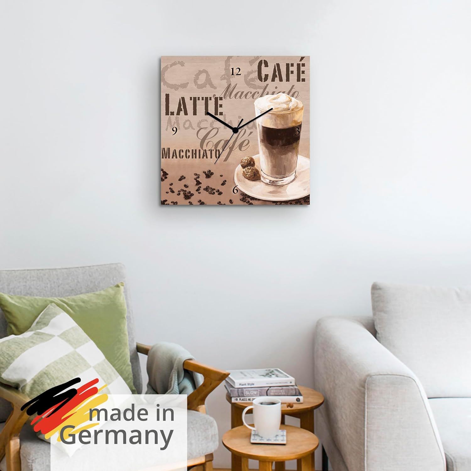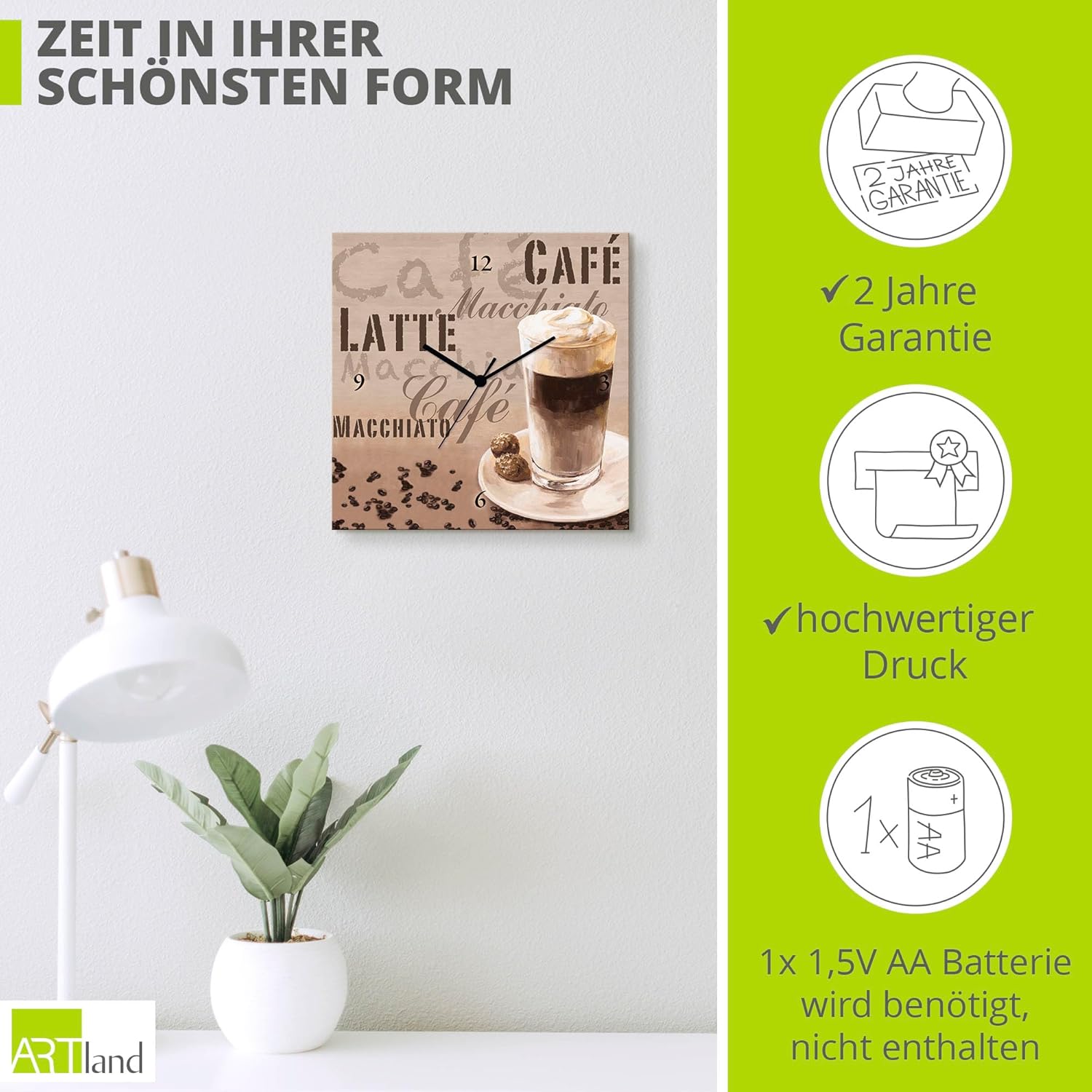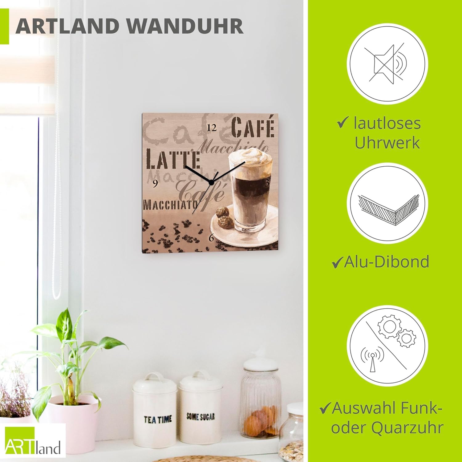 ARTLAND Wanduhr ohne Tickgeräusche Leinwand Quarzuhr 30x30 cm Quadratisch Lautlos Kaffee Coffee Cafe