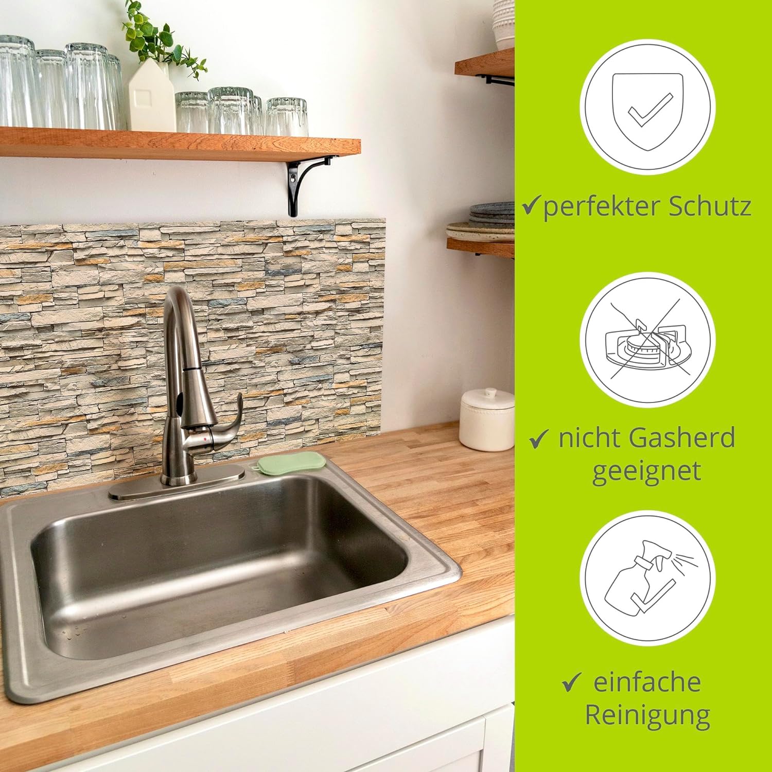 - MONTAGE: Der Küchenspritzschutz ist rückseitig mit einem Spezialklebeband ausgestatttet, sodass Sie die Rückwand in wenigen Schritten anbringen können. Wir empfehlen Ihnen die Kanten nach Ankleben ringsrum mit Silikon zu versiegeln