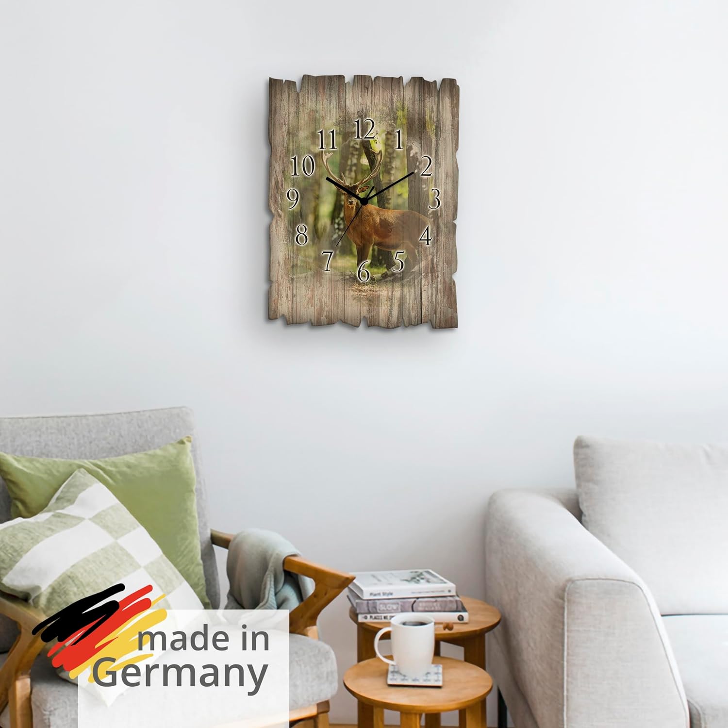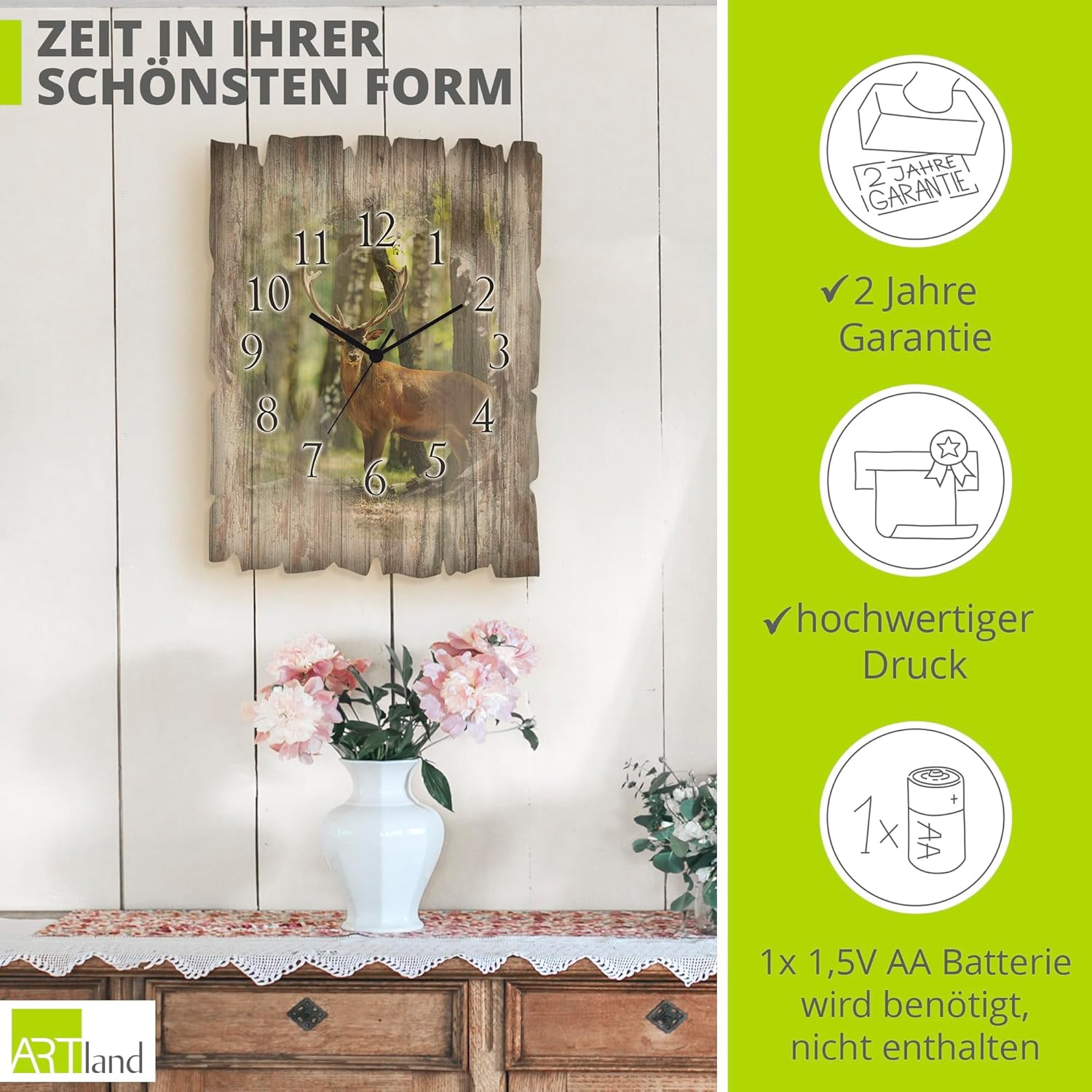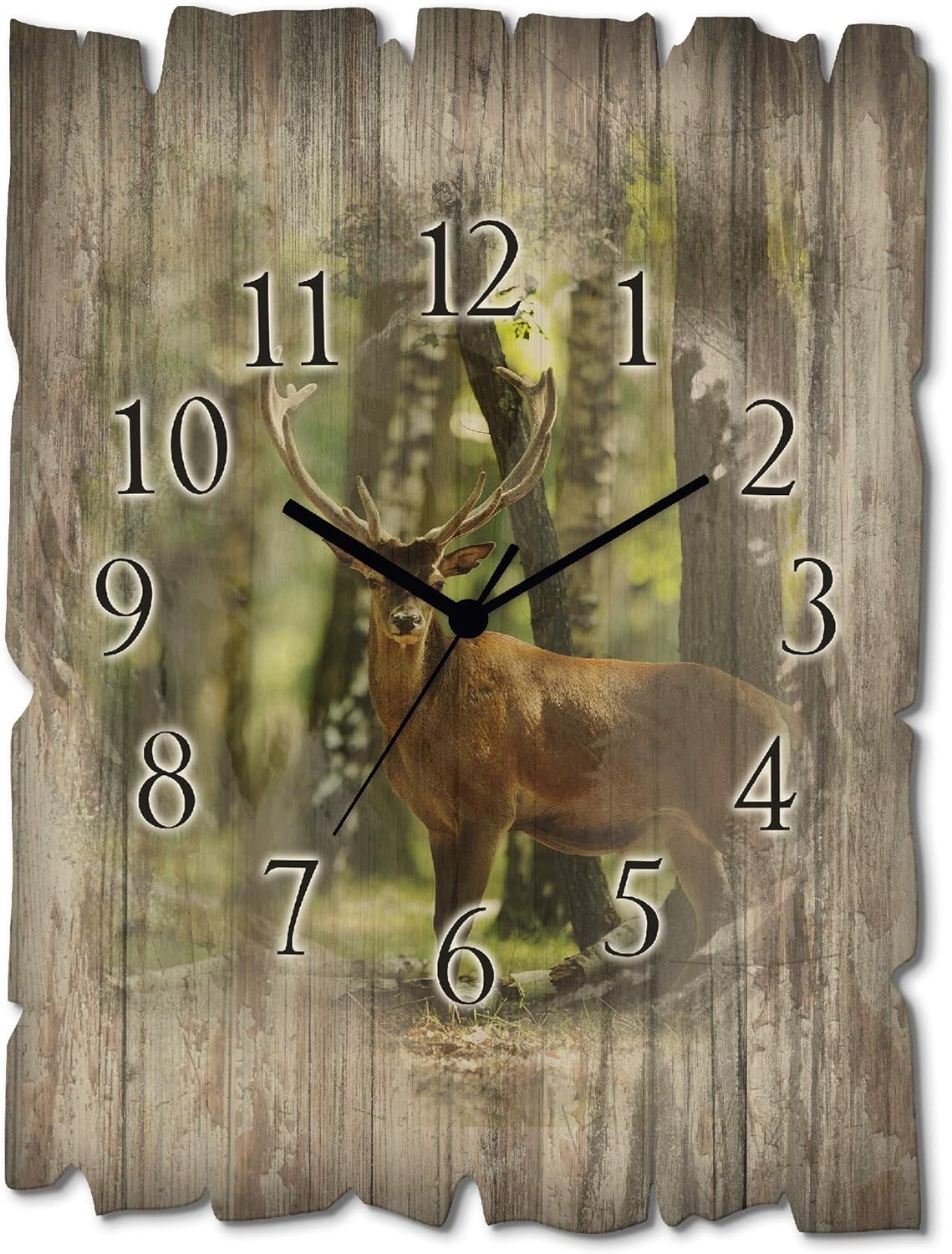 ARTLAND Wanduhr ohne Tickgeräusche aus Holz Quarzuhr 30x40 cm Rechteckig Lautlos Natur Tiere Hirsch