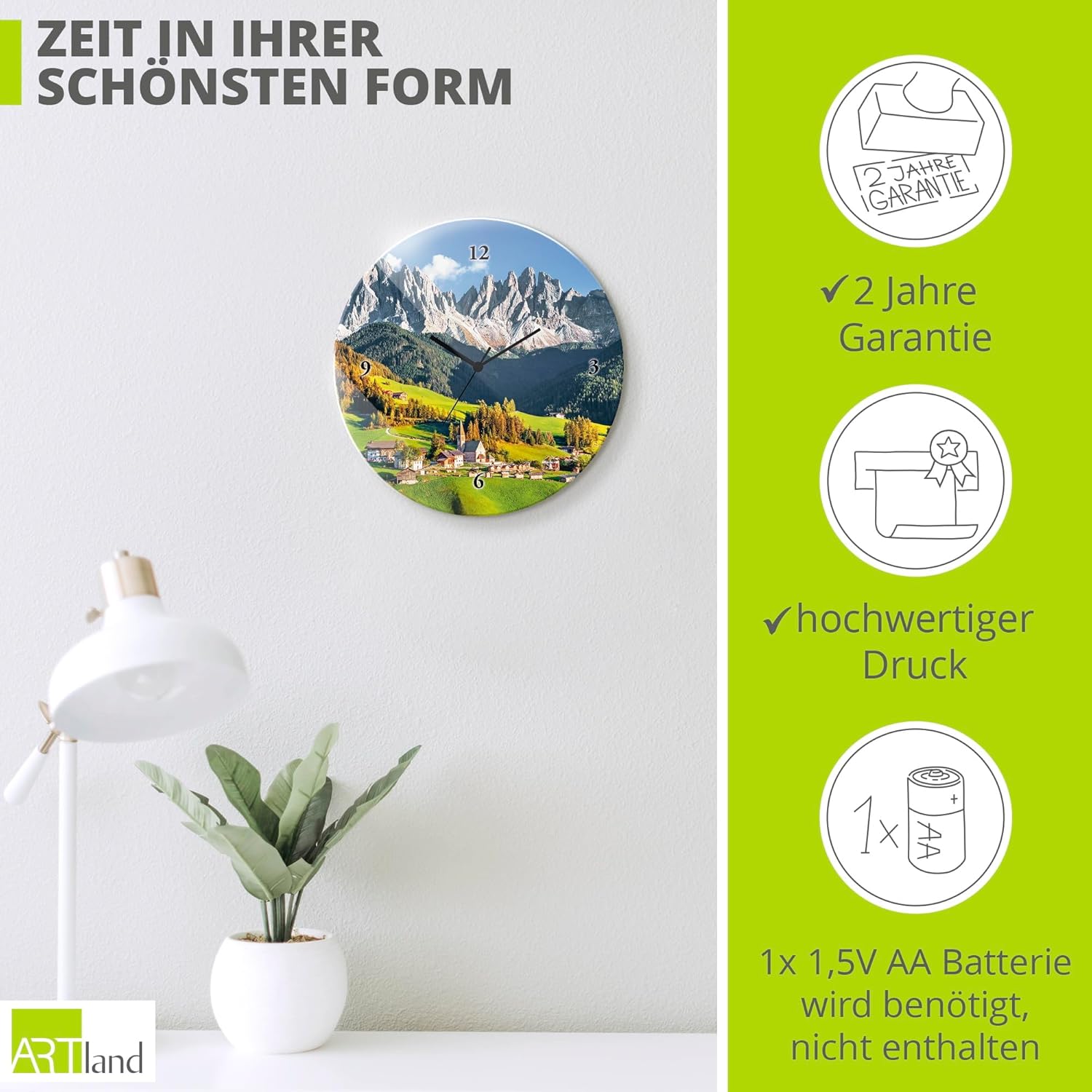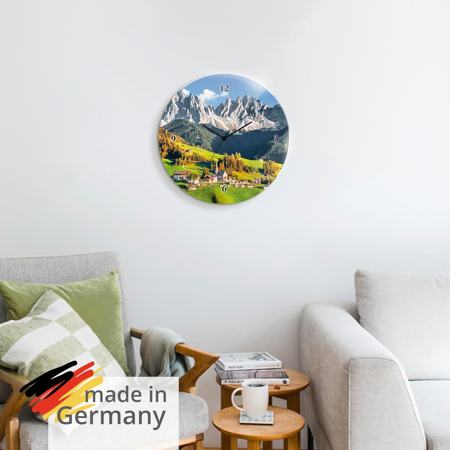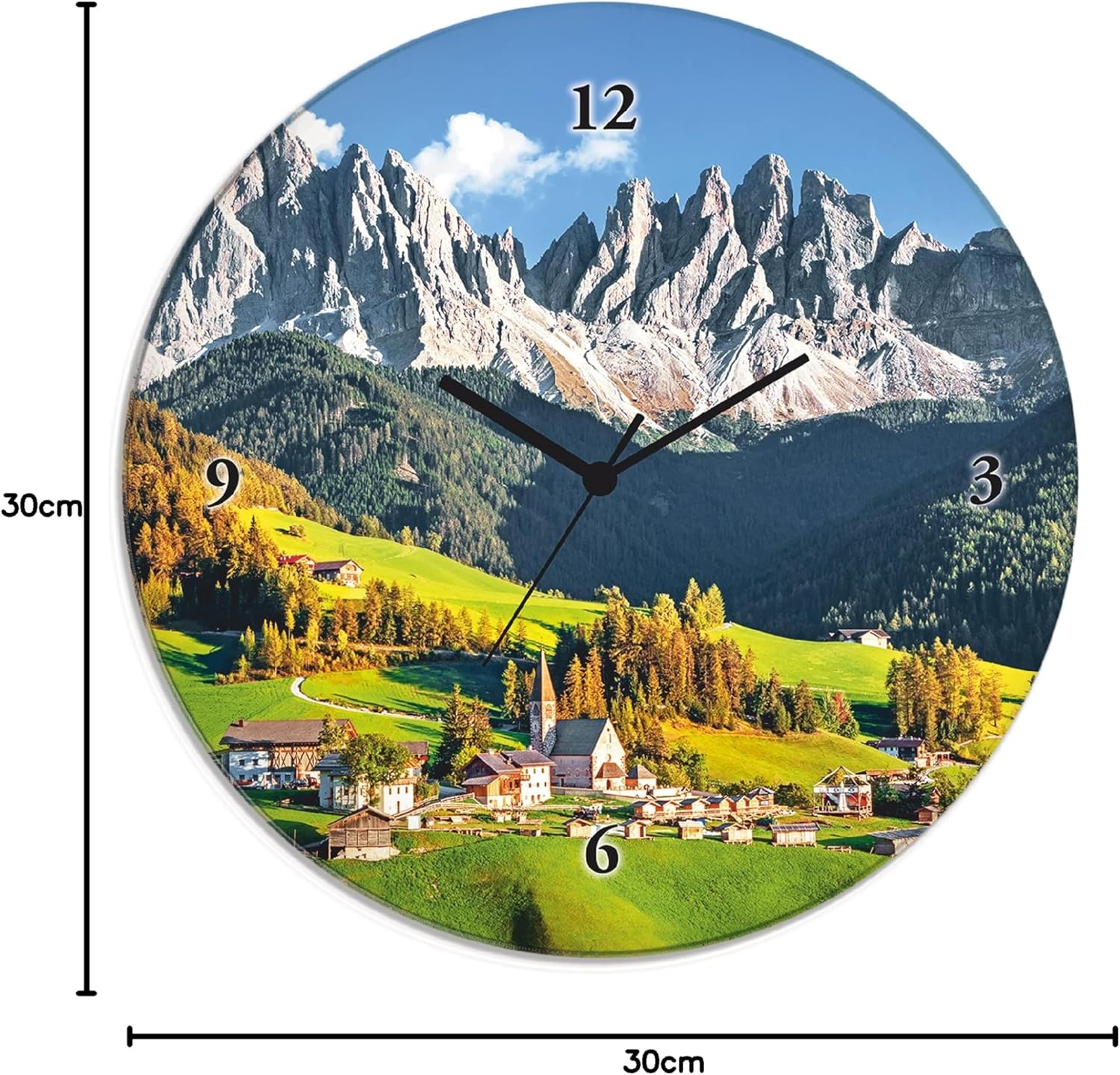 ARTLAND Wanduhr ohne Tickgeräusche Glas Funkuhr Ø 30 cm Rund Lautlos Alpen Landschaft Berge Natur Fr