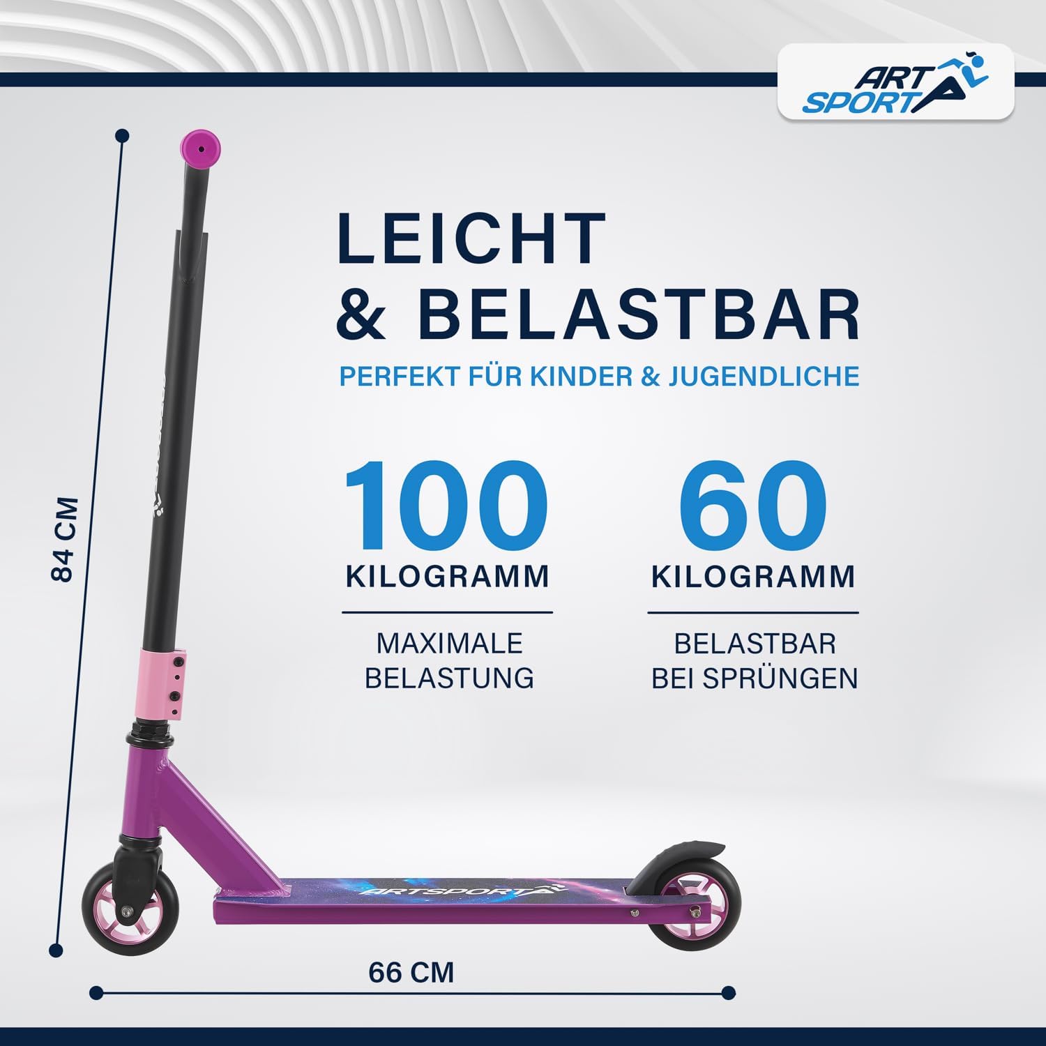 - ✅ Stabil & leicht: Konstruktion aus Aluminium und Stahl mit 4-fach verschraubter Klemme; Stuntroller bis 100 kg belastbar und bei Sprüngen bis 60 kg; Stunt Scooter für Kinder ab 6 Jahren & Teenager