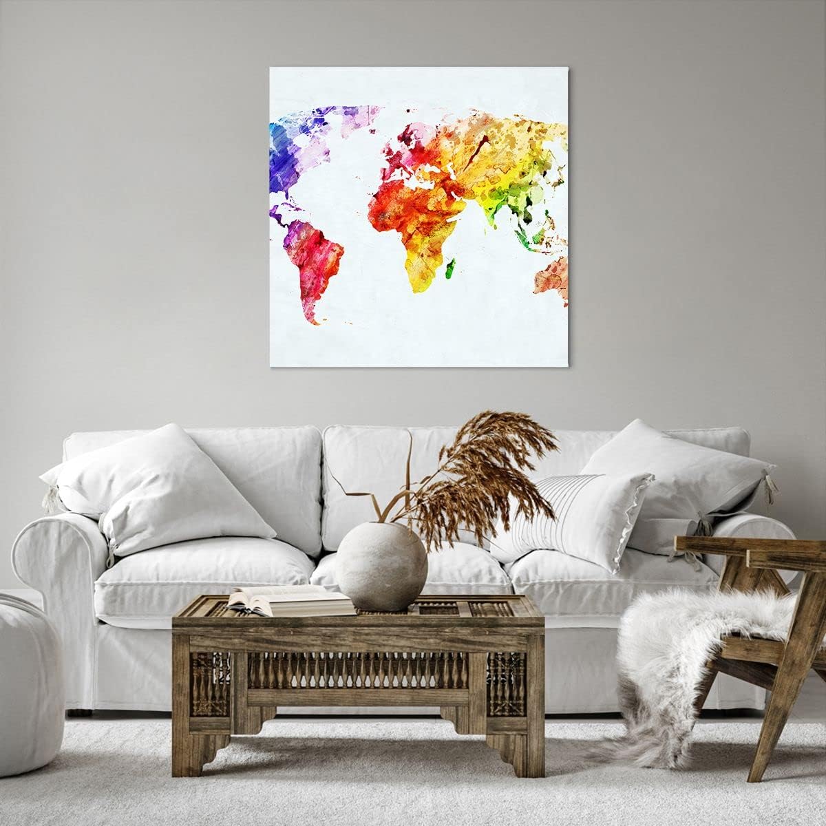 Bilder auf Leinwand 70x70cm Leinwandbild Welt Karte Bunt Kontinente Gross Wanddeko Bild Schlafzimmer