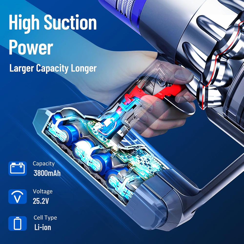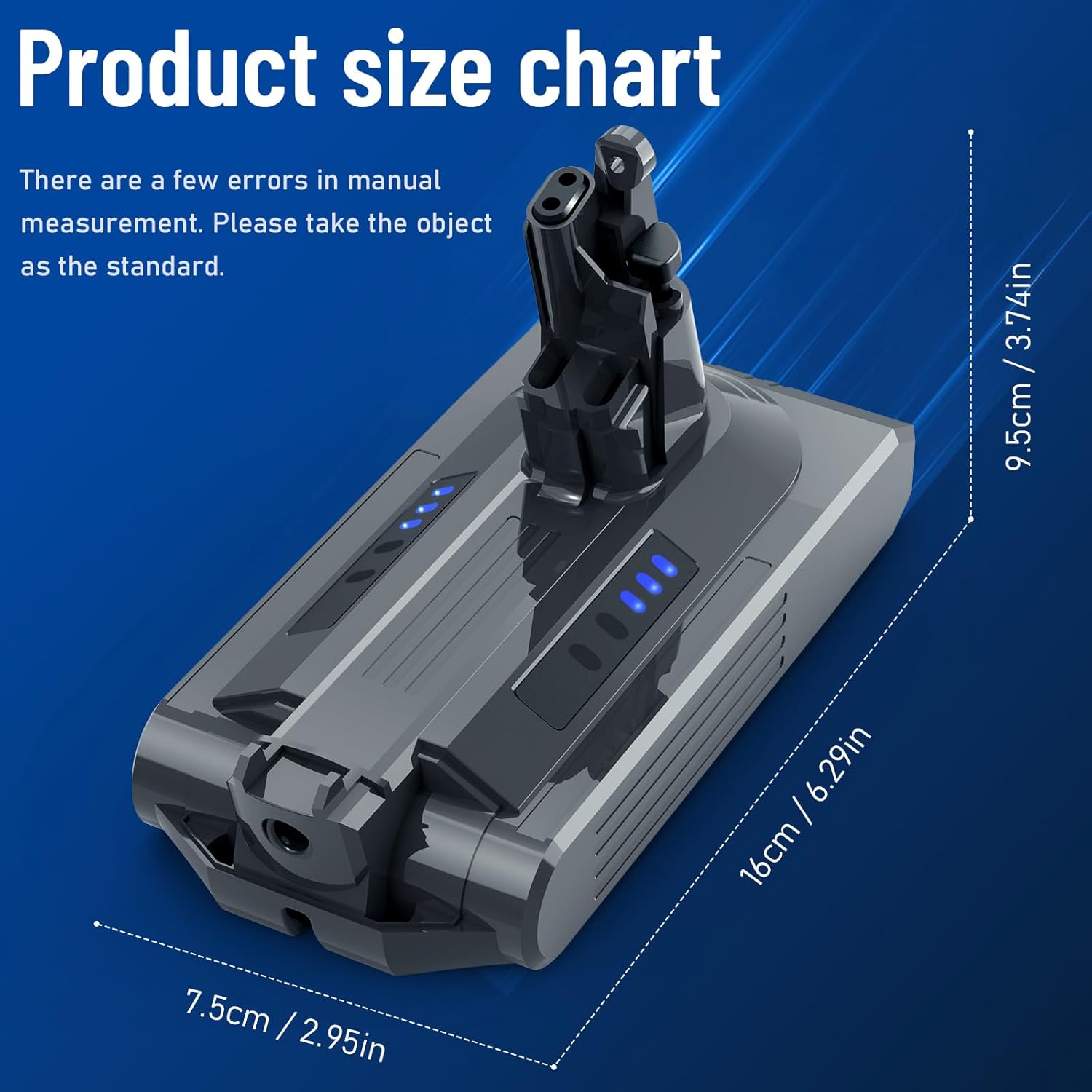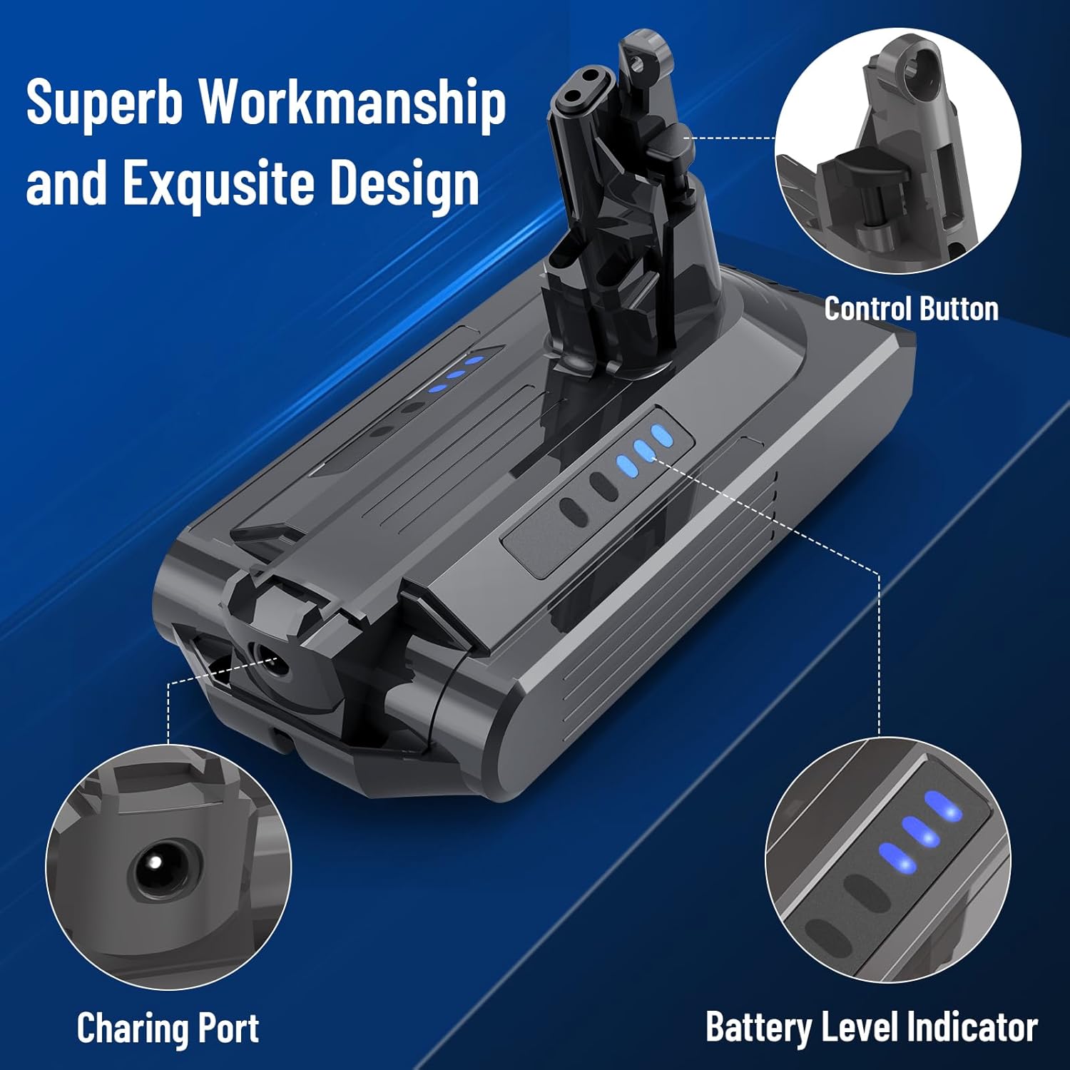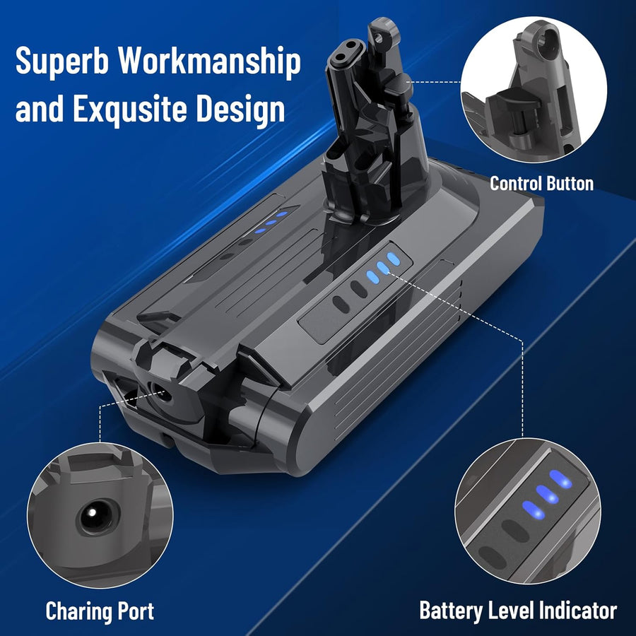 - Die V10-Batterie mit 3 LED-Leuchtanzeigen, die die verbleibende Leistung anzeigen. Sie können die verbleibende Akkuleistung schnell erkennen und dann das Laden des Akkus und den Betrieb des Staubsaugers planen. Wir empfehlen, den Akku mindestens alle zwei bis drei Wochen zu verwenden, lassen Sie den Akku nicht für längere Zeit im Ruhezustand.