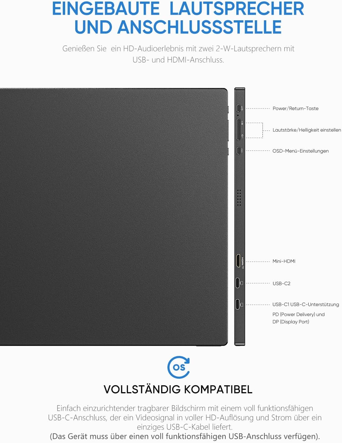 • [Plug-and-Play]: Es sind keine App und Treiber erforderlich, Sie benötigen nur ein USB-C-Kabel, um den tragbaren Monitor für sein Videosignal und Strom einzustellen, um eine Full-HD-Auflösung zu liefern.