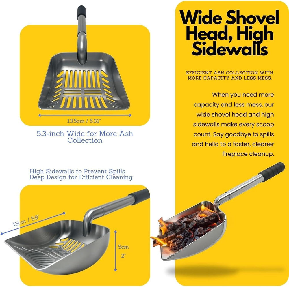 - Verbesserte Aschekontrolle: Diese Schaufel ist in der Lage, mehr Asche in kürzerer Zeit zu handhaben, verhindert Verschütten mit ihrem ausgezeichneten 13,5 cm breiten Kopf mit hohen Seitenwänden