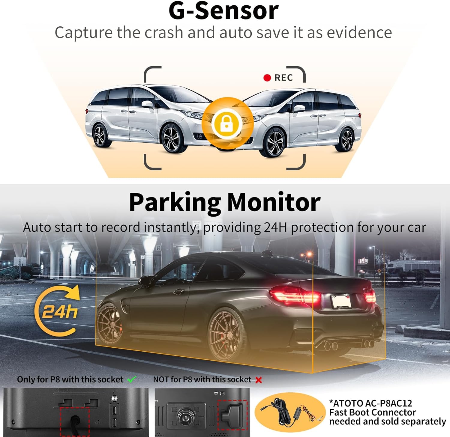 - 【Parküberwachung】Mit dem AC-P8AC12 (separat erhältlich), der P8 ständig mit Strom versorgt, aktiviert sich P8 in Sekunden bei Kollisionen oder Erschütterungen. Die Frontkamera AC-FCR01W nimmt dann 20 Sekunden entscheidendes Videomaterial auf, das