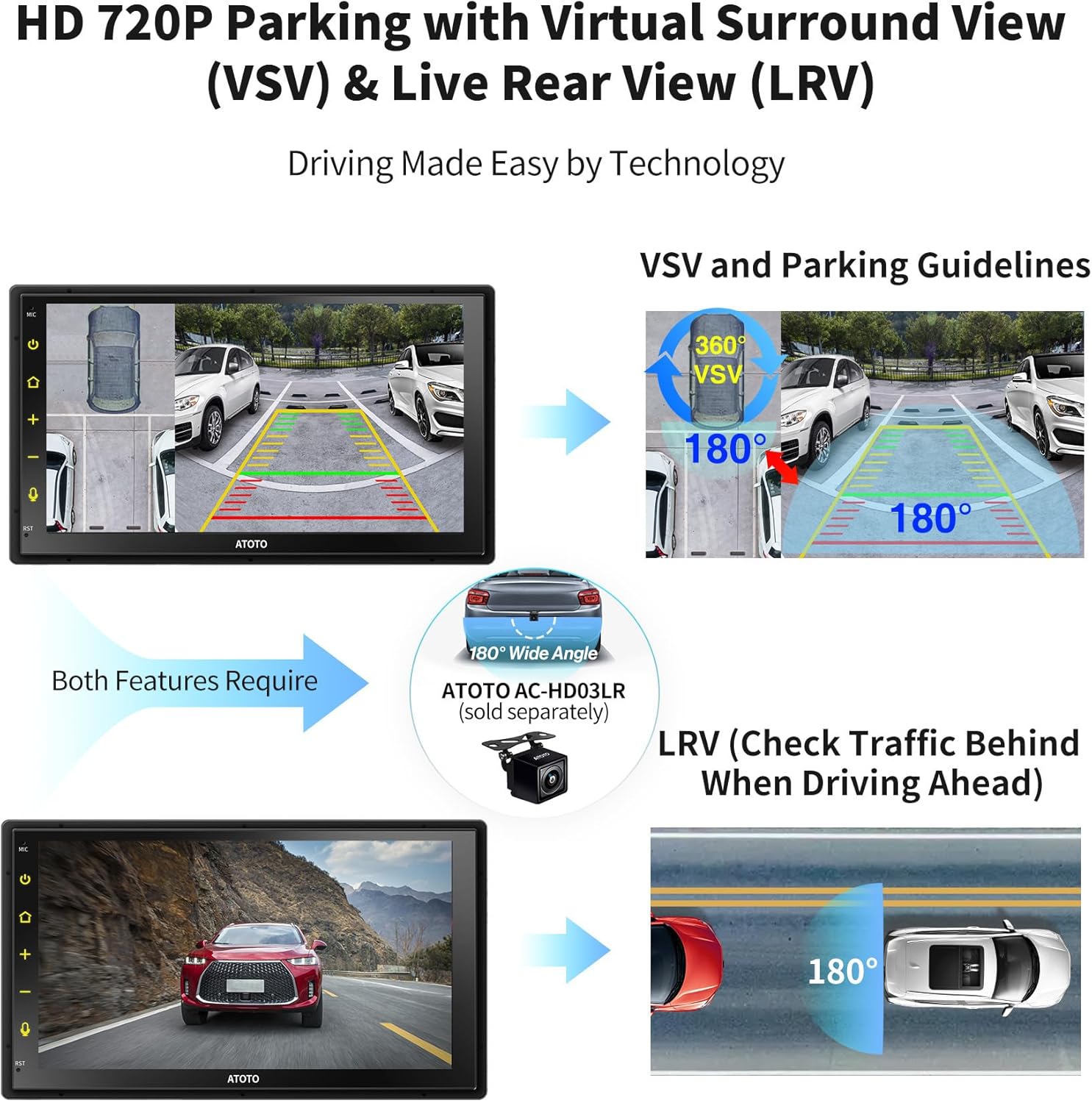 - S8 (Gen2) Massenpopularisierung integriert sich mit ATOTO AC-HD02LR oder AC-HD03LR Kameras für HD-Rückansichtsbilder und Live RearView (LRV), die sogar während der Fahrt zugänglich sind, verbessert die Sichtbarkeit, indem sie Hindernisse wie