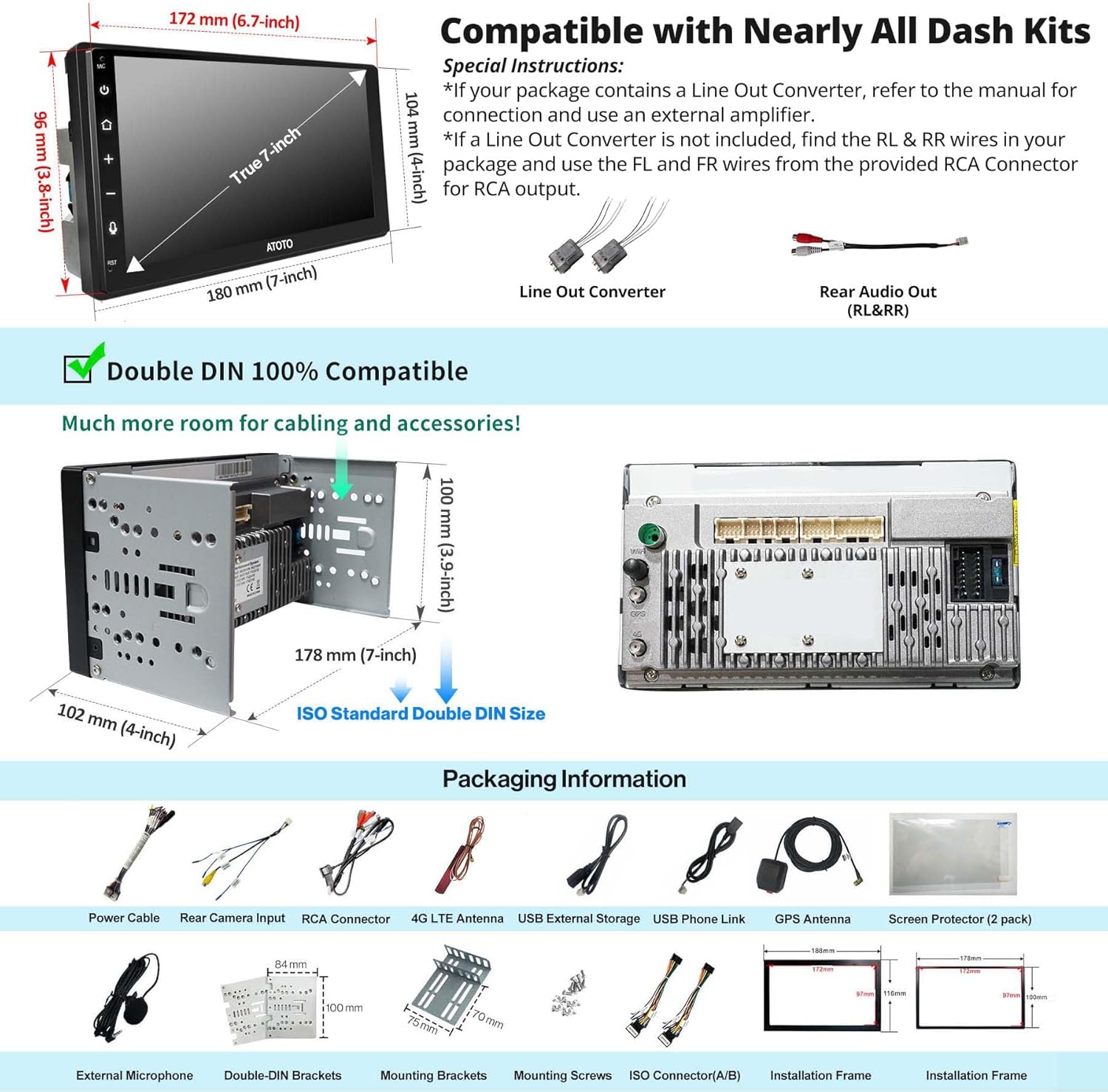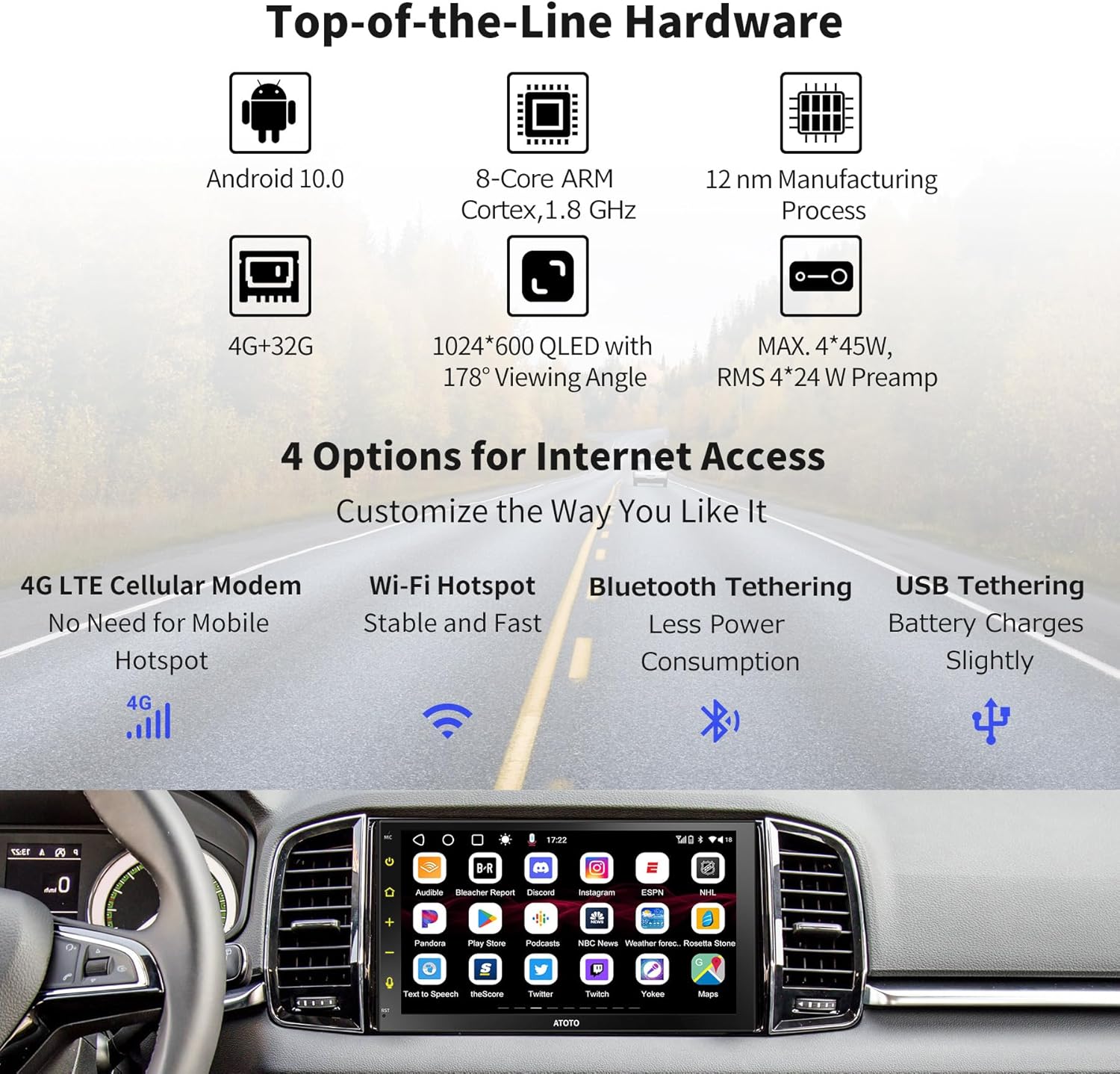 - Das S8G2B74MS verwendet die UDH07D-Montage (Universelles Doppel-DIN-Headunit mit 7-Zoll-Display), was eine Passform mit den meisten Doppel-DIN-Einbaukits für ein nahtloses Aussehen gewährleistet. ATOTO stellt regelmässige Firmware-Updates für das