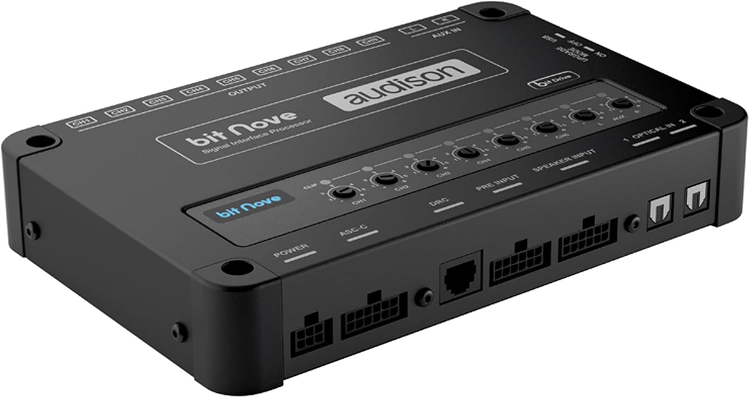 PRODUKTBESCHREIBUNGEN Audison bit Nove 9-Kanal DSP mit 6-Kanal Eingang und Hi-Res Audio Verarbeitung in 24bit/192kHz Eingangskonnektivität: Mit 6 Highlevel (3 ÷ 20 V) und Lowlevel (1,2 ÷ 8 V) Pegeleingängen ausgestattet, kann der Bit Nove mit jeder Art von Aftermarket und OEM-Quelle verwendet werden. Der zusätzliche Cinch-Eingang (0,3 ÷ 5 V) ist ideal, um Ihr Smartphone oder Tablet mit dem Bit Nove zu verbinden und so die höchstmögliche Qualität zu bieten. Die fortschrittliche PC-Software fasst die Kanäle zusammen, die zur gleichen Front gehören und entkoppelt die OEM-Quellfrequenz in wenigen einfachen Schritten. Es gibt auch zwei optische Digitaleingänge mit einer maximalen akzeptierten Auflösung von 192 kHz / 24 Bit, um gleichzeitig ein Audison-Bit-DMI mit dem Bit Nove (wobei das digitale Audio vom MOST-Bus des Autos übernommen wird) und dem Hi-Res-Bit Play HD-Player zu verbinden. USS - Universeller Lautsprecher-Simulator: Dank der Integration der USS-Technologie kann das Bit Nove auch an Steuergeräte angeschlossen werden, die über die "Speaker Load Detection" -Schaltung verfügen, die andernfalls den Audiosignalausgang stumm schalten würde. Ausgangskonnektivität: Das Bit Nove verfügt über neun Ausgangskanäle mit Cinch-Anschlüssen, und bietet eine grosse Anzahl aktiver Konfigurationen mit mehreren Verstärkern, wodurch eine grosse Auswahl an Einrichtungsoptionen zur Verfügung stehen. Der leistungsstarke DSP bietet für jeden Kanal: einen 10-poligen parametrischen Equalizer für optimale Einstellungen, einen 68-stufigen Frequenzweiche, Butterworth- oder Linkwitz-Riley-Filter mit Flanken von 6 bis 24 dB / Okt und eine Zeitverzögerung. inkl. DRC AB (Fernbedienung) DRC AB ermöglicht die Steuerung des Hauptsystems (Lautstärke, Balance, Fader und Subwoofer-Lautstärke, Bass-Boost) ohne Verwendung eines PCs. Dank dieser Vorrichtung, die an einer ergonomischen Position innerhalb des Armaturenbretts des Fahrzeugs angebracht ist, kann der Benutzer: zwischen den vier.