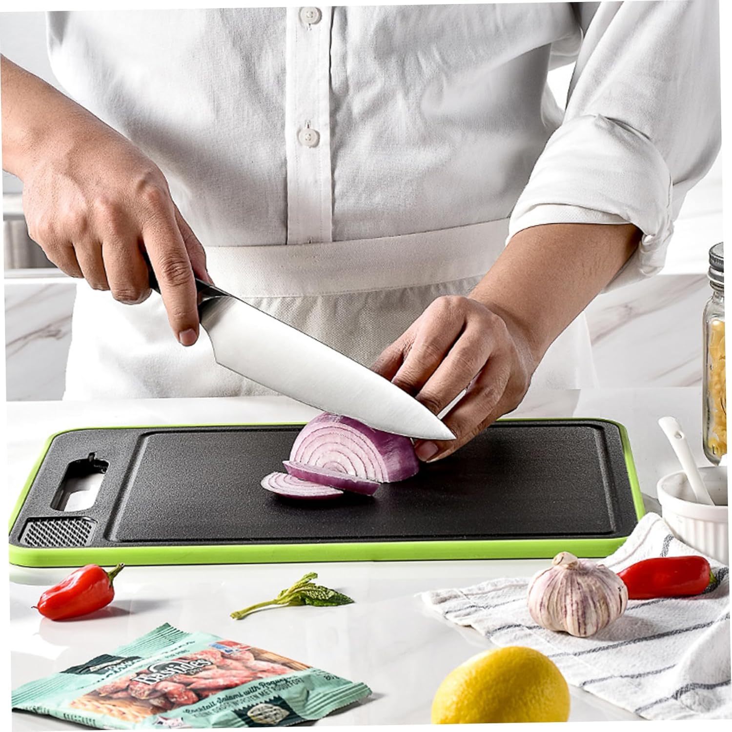 - 4-in-1-Funktionsdesign: Das 4-in-1-Choping Board wird mit Reifen und Spitzer ausgestattet, das nahtlos Auftauen, Mahlen von Nahrung, Honenschneider und das Hacken von Lebensmittelfunktionen kombiniert..Diese Abentfeuchte des Teilens widersetzt sich