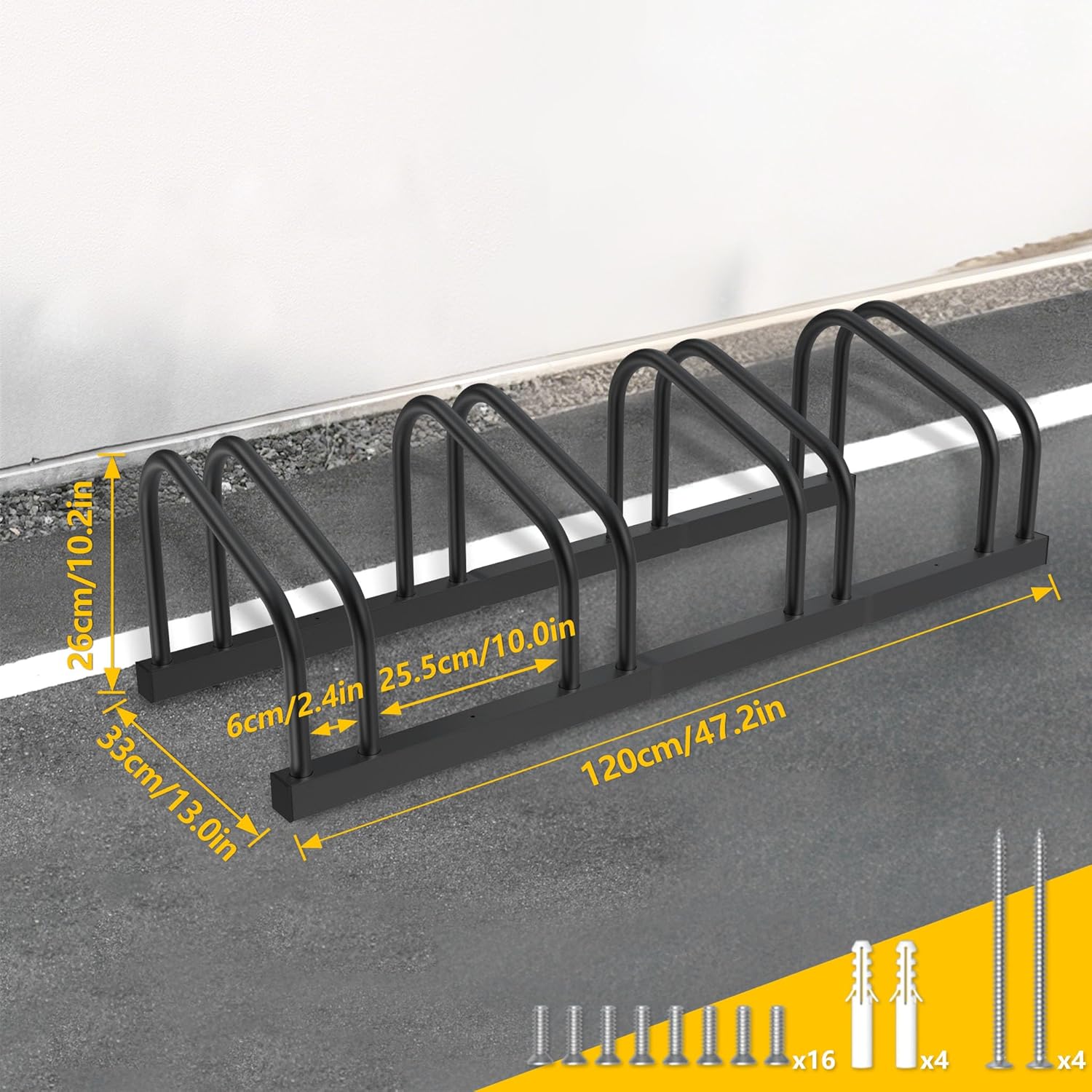 - ✅ Platzsparendes Design – ideale Fahrradhalterung für Garage und Keller: Dank versetzter Anordnung der Haltebügel können Fahrräder platzsparend und geordnet nebeneinander geparkt werden – ohne umständliches Rangieren. Der stabile Aufbau sorgt