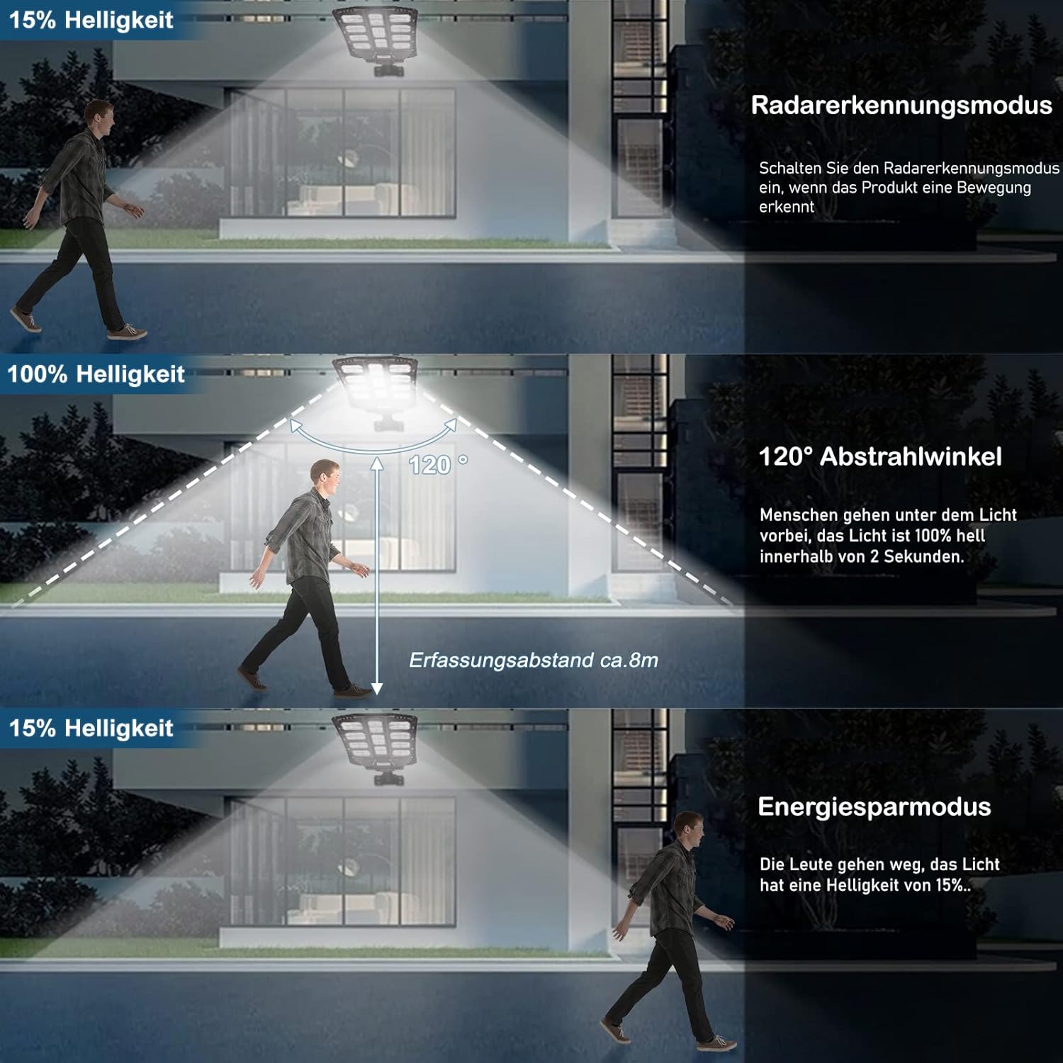 - ☀️【Ultrahohe Helligkeit】Ultrahelle 400W-Solarstrassenlaterne, die Solarstrassenlaterne hat 1056 LED-Lampenperlen, 8000 K weisses Licht; die Solarstrassenlaterne verwendet polykristalline Silizium-Solarmodule, die tagsüber 6-7 Stunden aufgeladen