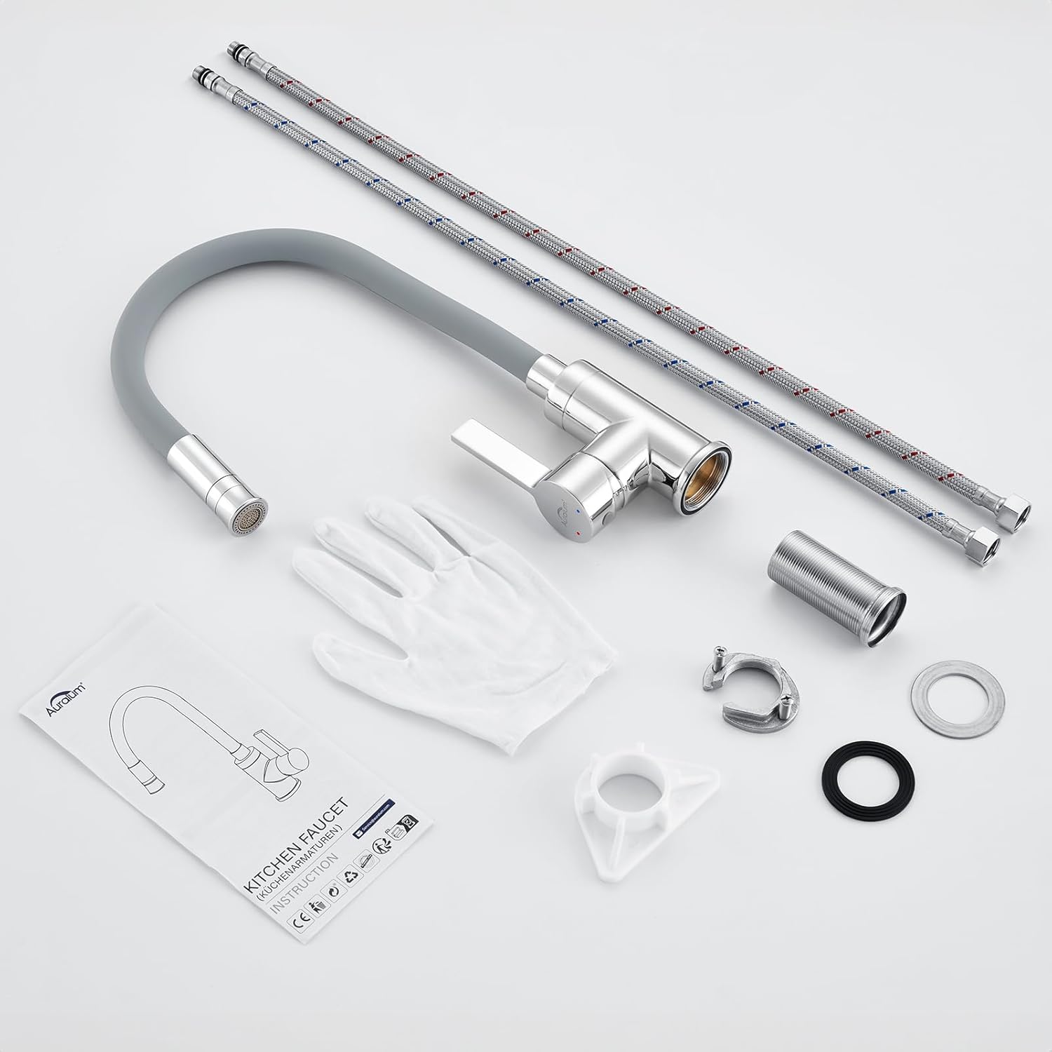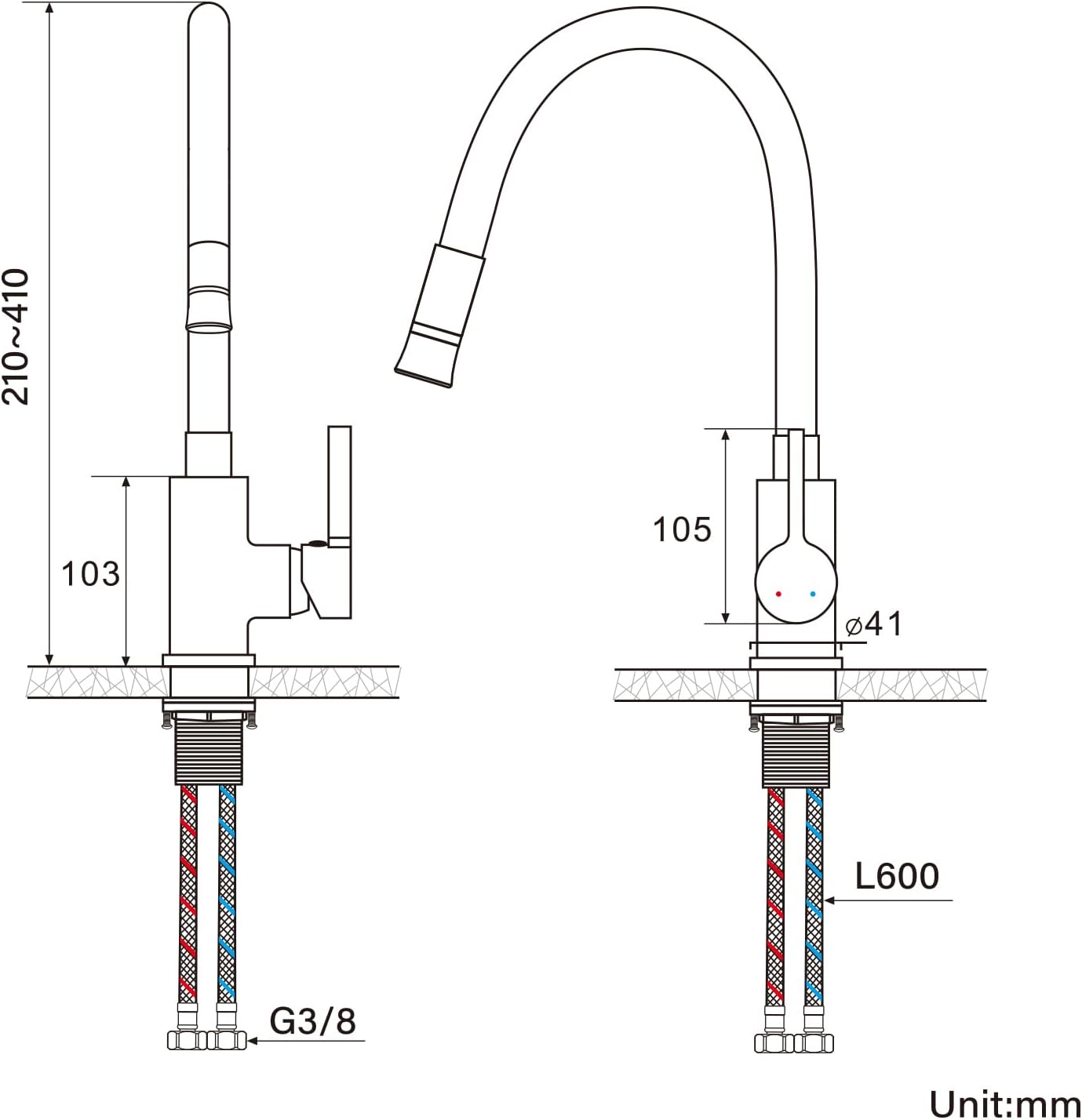 - SCHNELLE INSTALLATION: Das benötigte Zubehör ist vollständig enthalten, mit wenigen Handgriffen kann man selbst Auralum Spültischarmatur Küche installieren. Montageloch: ø32-38mm. 2 x 60cm Schläuche, und universeller G3/8 Anschluss.
