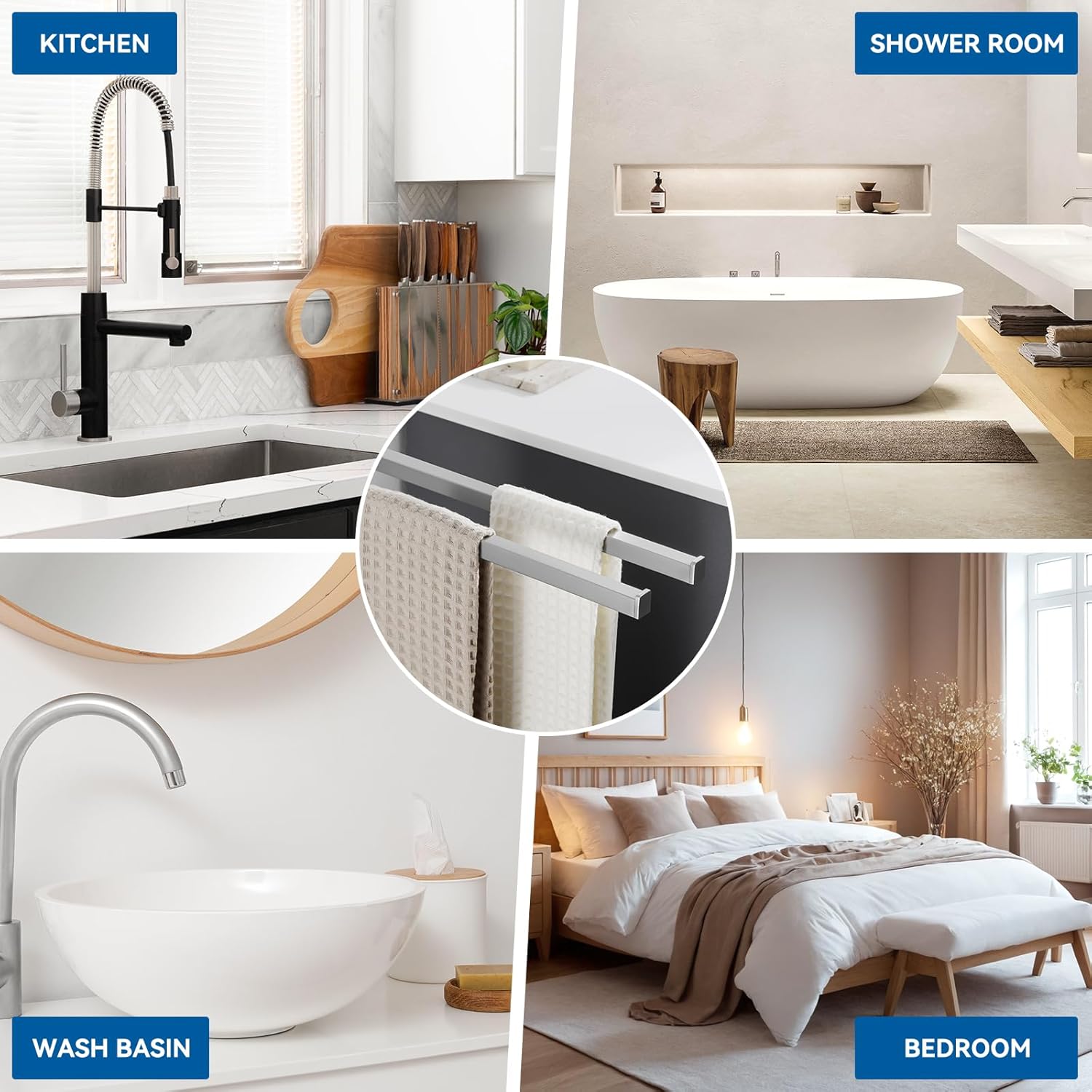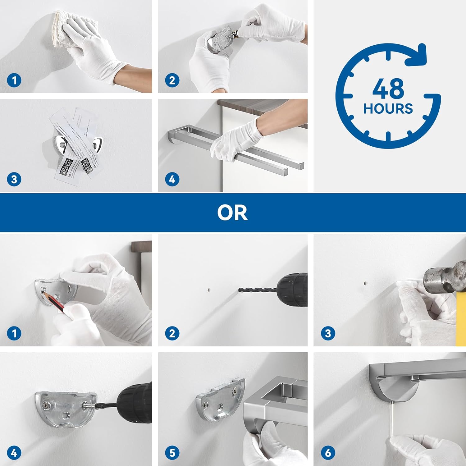 - HANDTUCHHALTER OHNE BOHREN: Tragen Sie Kleber auf die Unterseite des Handtuchhalters auf, kleben Sie ihn an die Wand und Warten Sie 48 Stunden, Warten Sie, bis der nagelfreie Kleber vollständig ausgehärtet ist,bevor Sie den Hauptkörper