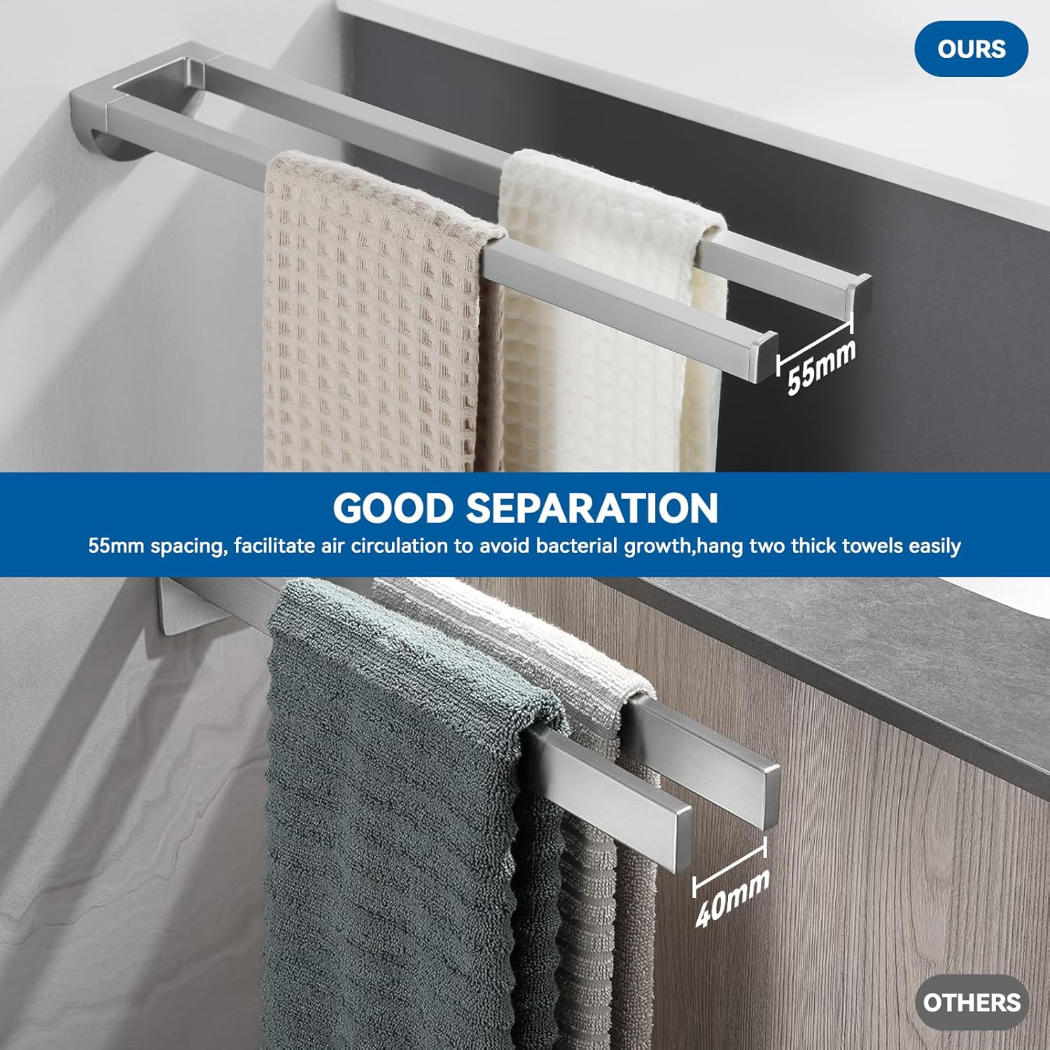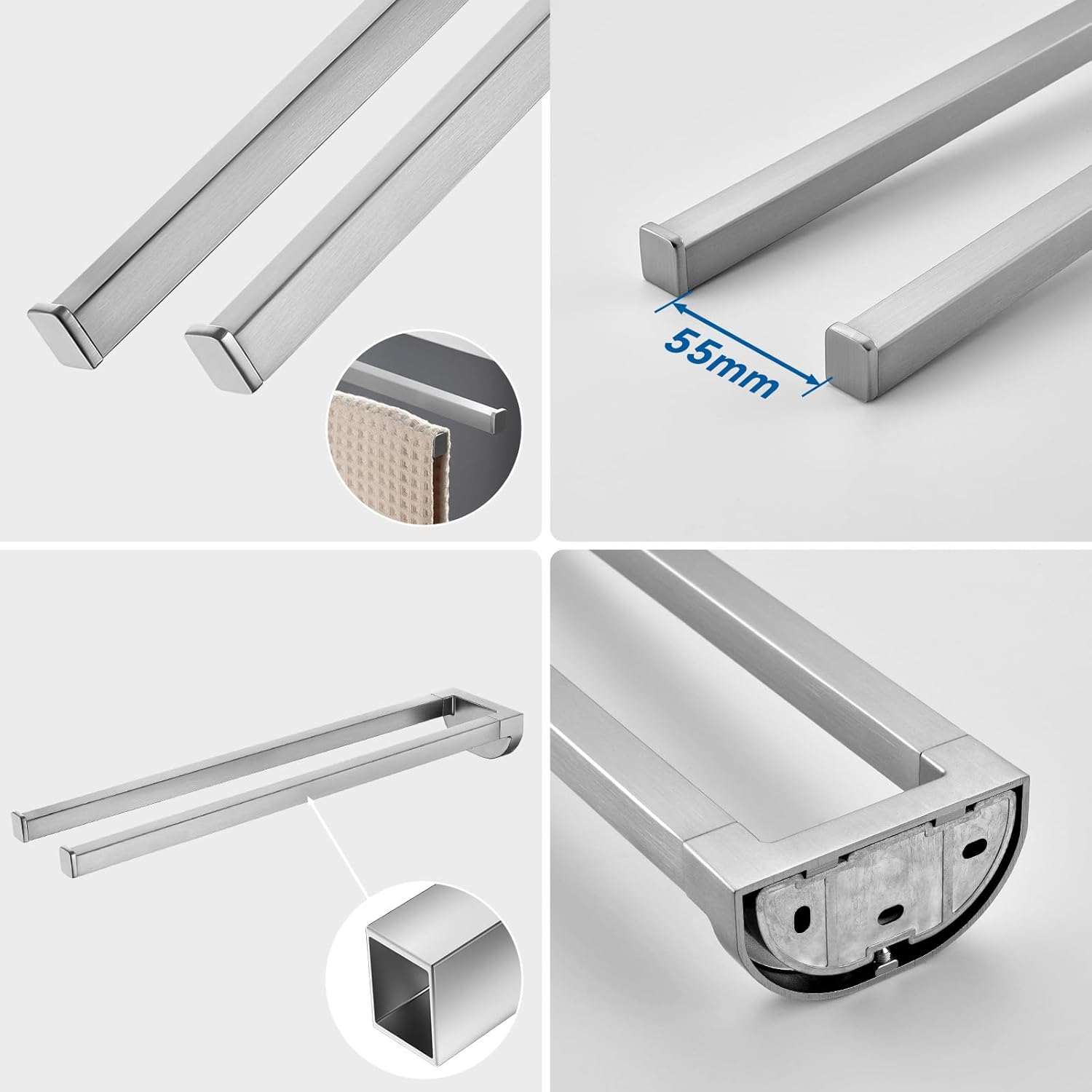 - HANDTUCHHALTER ZWEIARMIG: Die Länge des Badezimmer-Handtuchhalters beträgt 42 cm, sodass Handtücher flach ausgelegt oder mehrere Handtücher gleichzeitig aufgehängt werden können. Der Abstand zwischen den beiden Stangen beträgt 55 cm, um eine
