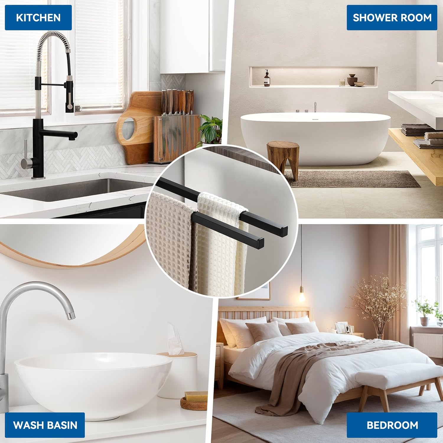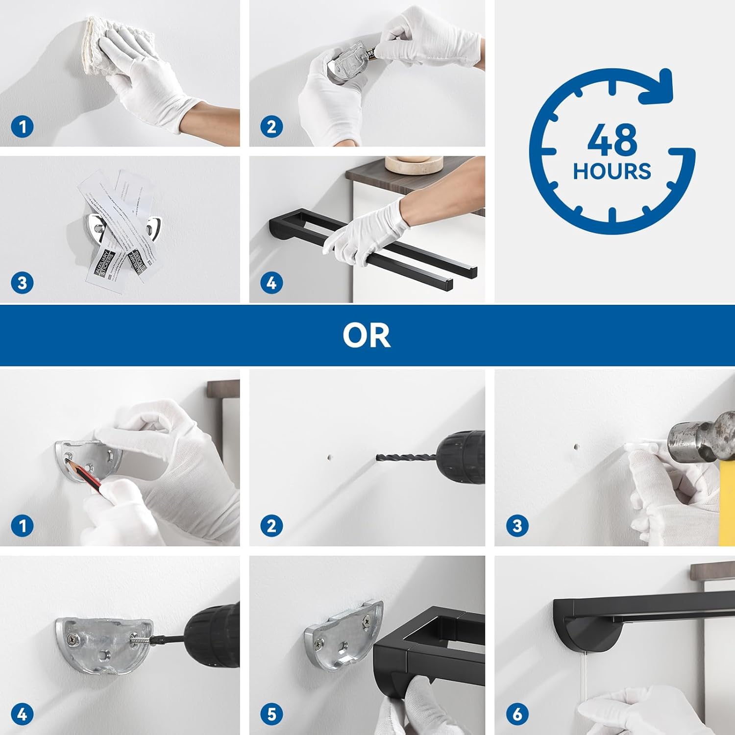 - HANDTUCHHALTER OHNE BOHREN: Tragen Sie Kleber auf die Unterseite des Handtuchhalters auf, kleben Sie ihn an die Wand und Warten Sie 48 Stunden, Warten Sie, bis der nagelfreie Kleber vollständig ausgehärtet ist,bevor Sie den Hauptkörper