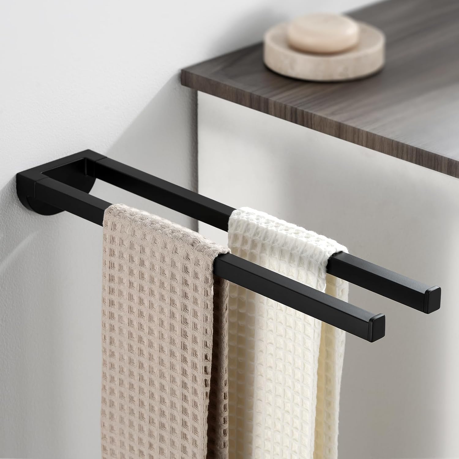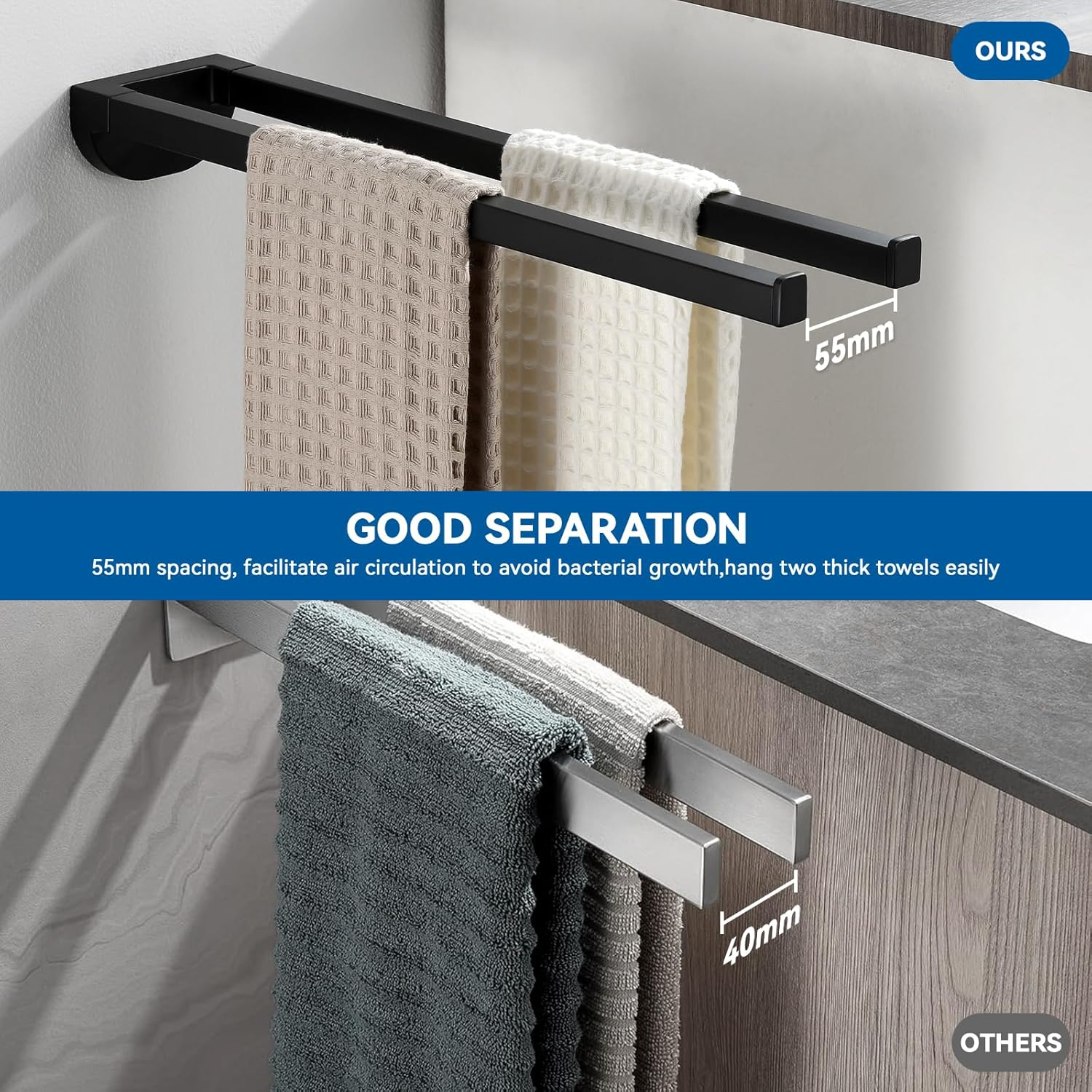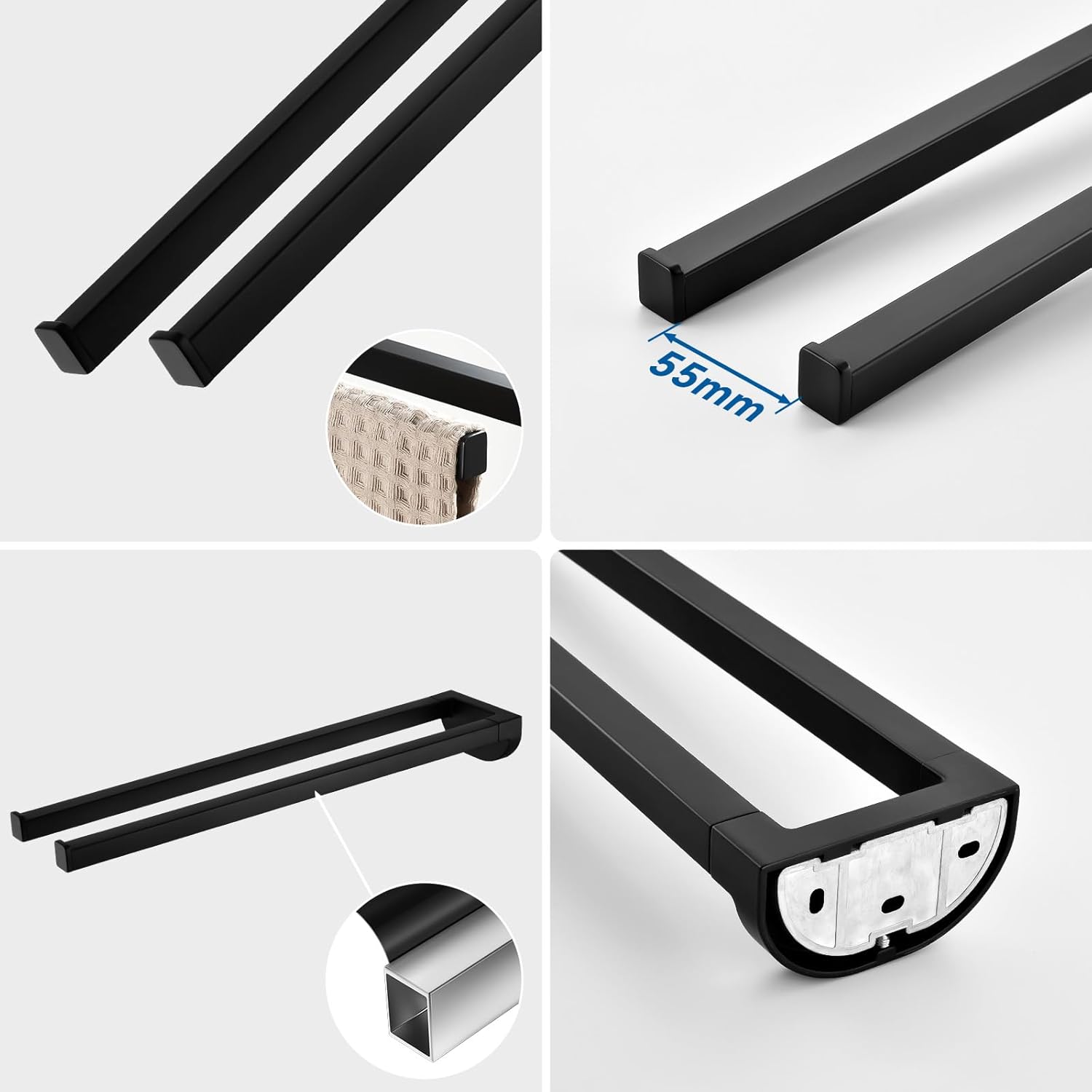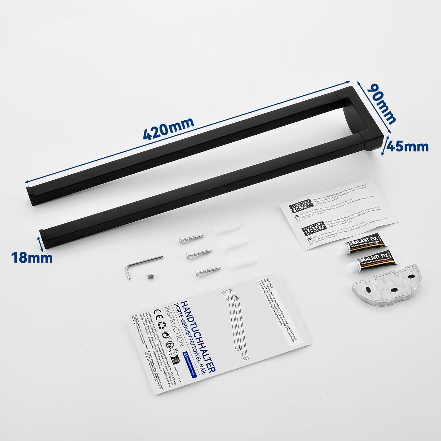 - HANDTUCHHALTER ZWEIARMIG: Die Länge des Badezimmer-Handtuchhalters beträgt 42 cm, sodass Handtücher flach ausgelegt oder mehrere Handtücher gleichzeitig aufgehängt werden können. Der Abstand zwischen den beiden Stangen beträgt 55 cm, um eine