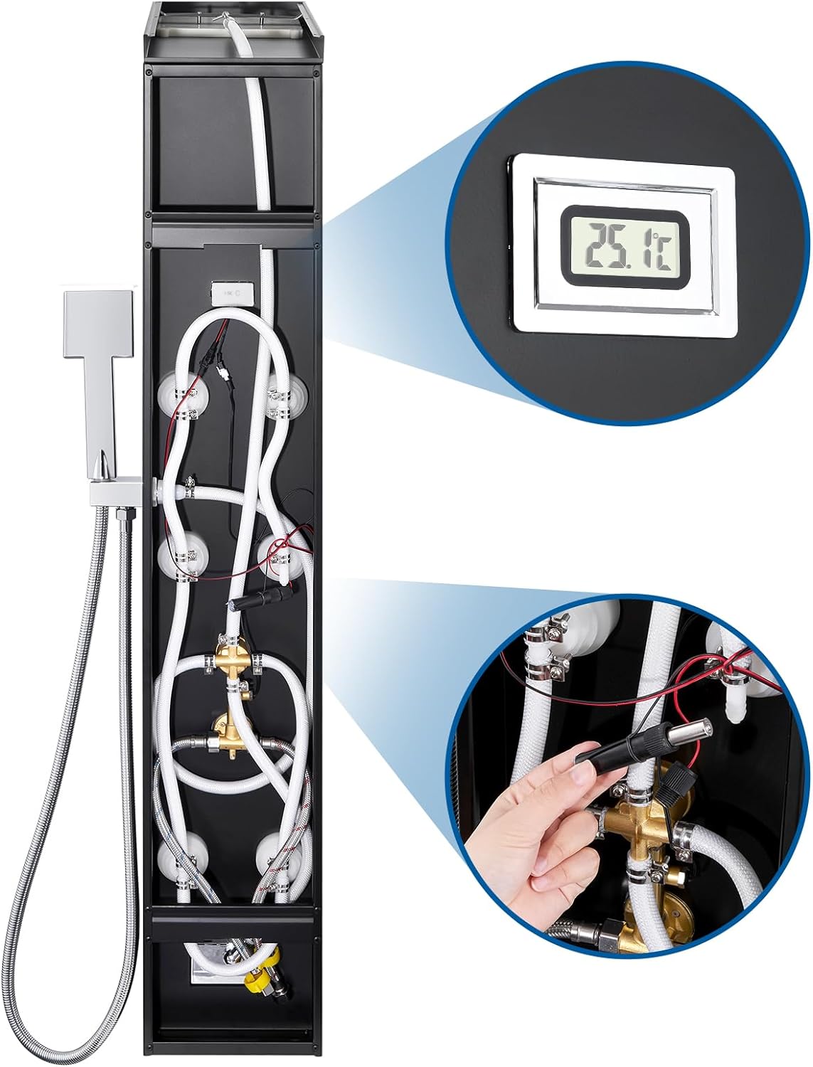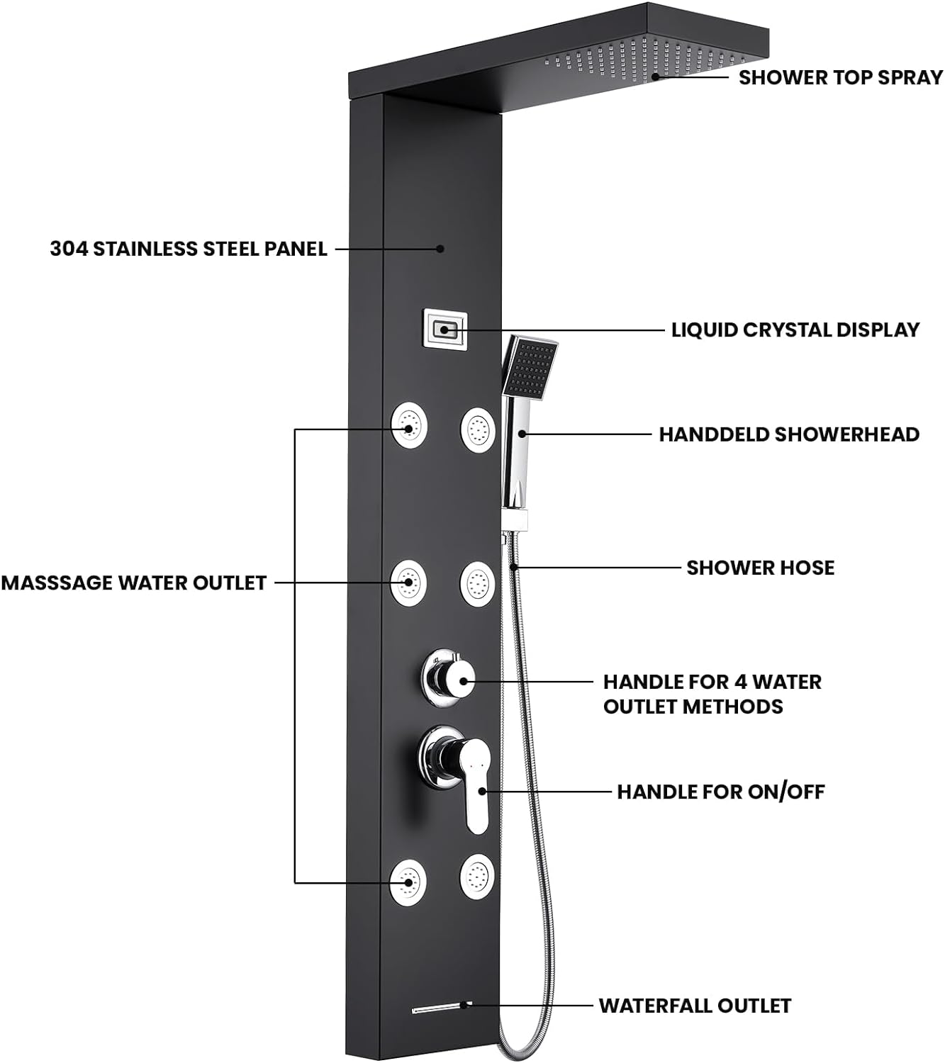 - MULTIFUNKTIONALES DUSCHPANEL: Dieses Duschpaneele vereint 4 Wassermodi in einem. Es hat zwei Griffe und einen LCD-Bildschirm, der Ihnen die Wassertemperatur in Echtzeit anzeigt, damit Sie sich beruhigt waschen können.