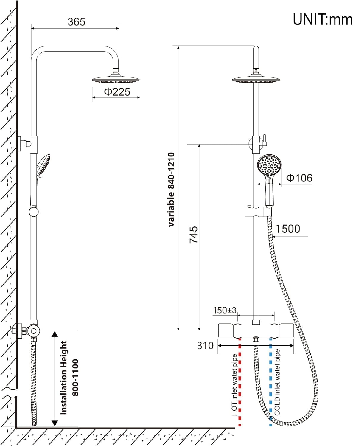 - SCHNELLE UND KOSTENEFFIZIENTE INSTALLATION: Anschluss mit G1/2-Muttern gemäss den europäischen Normen, einstellbarer Thermostatabstand 150 ± 10mm. Sie können die Fünf-Länder-Installationsanleitung oder die Videoanleitung für duschsystem mit