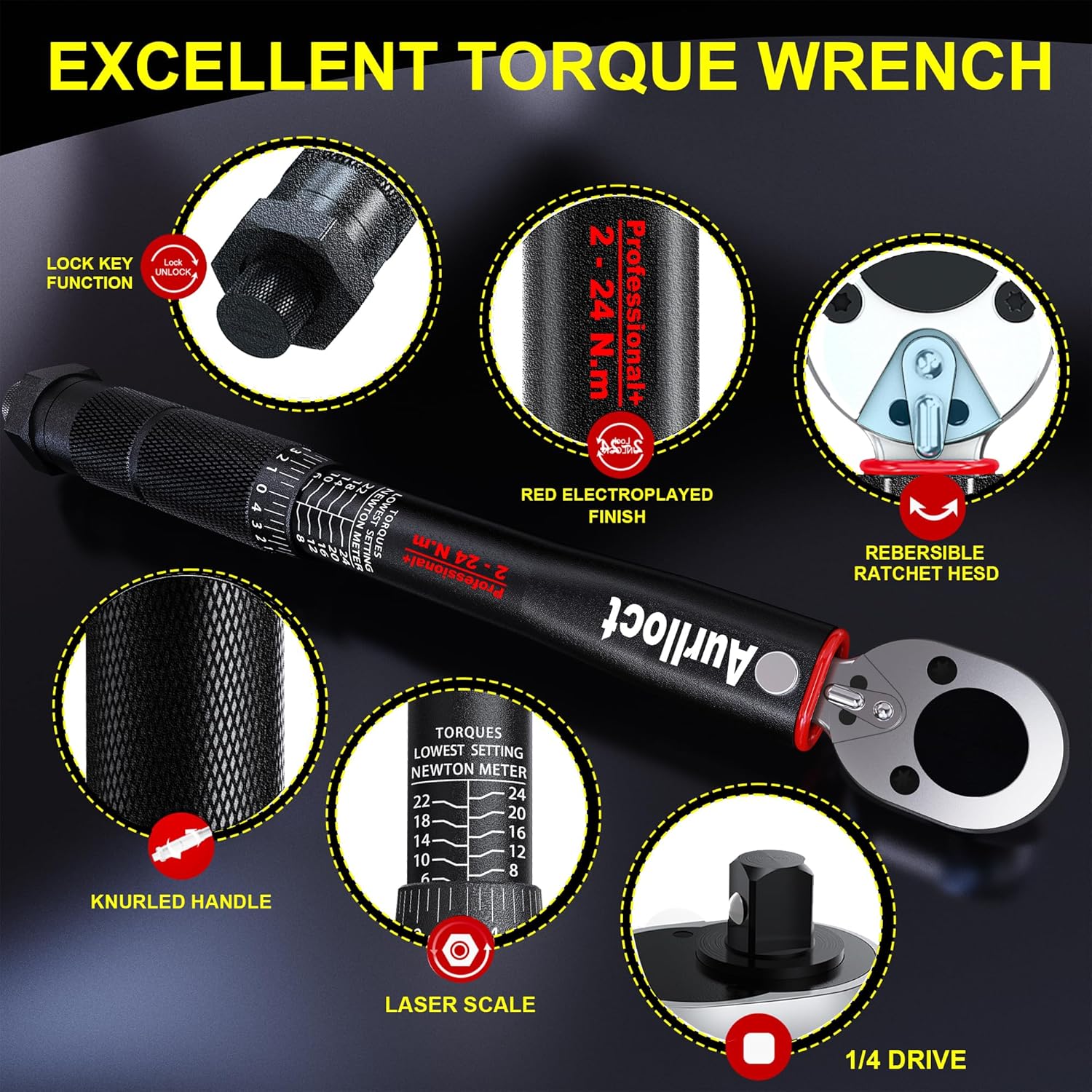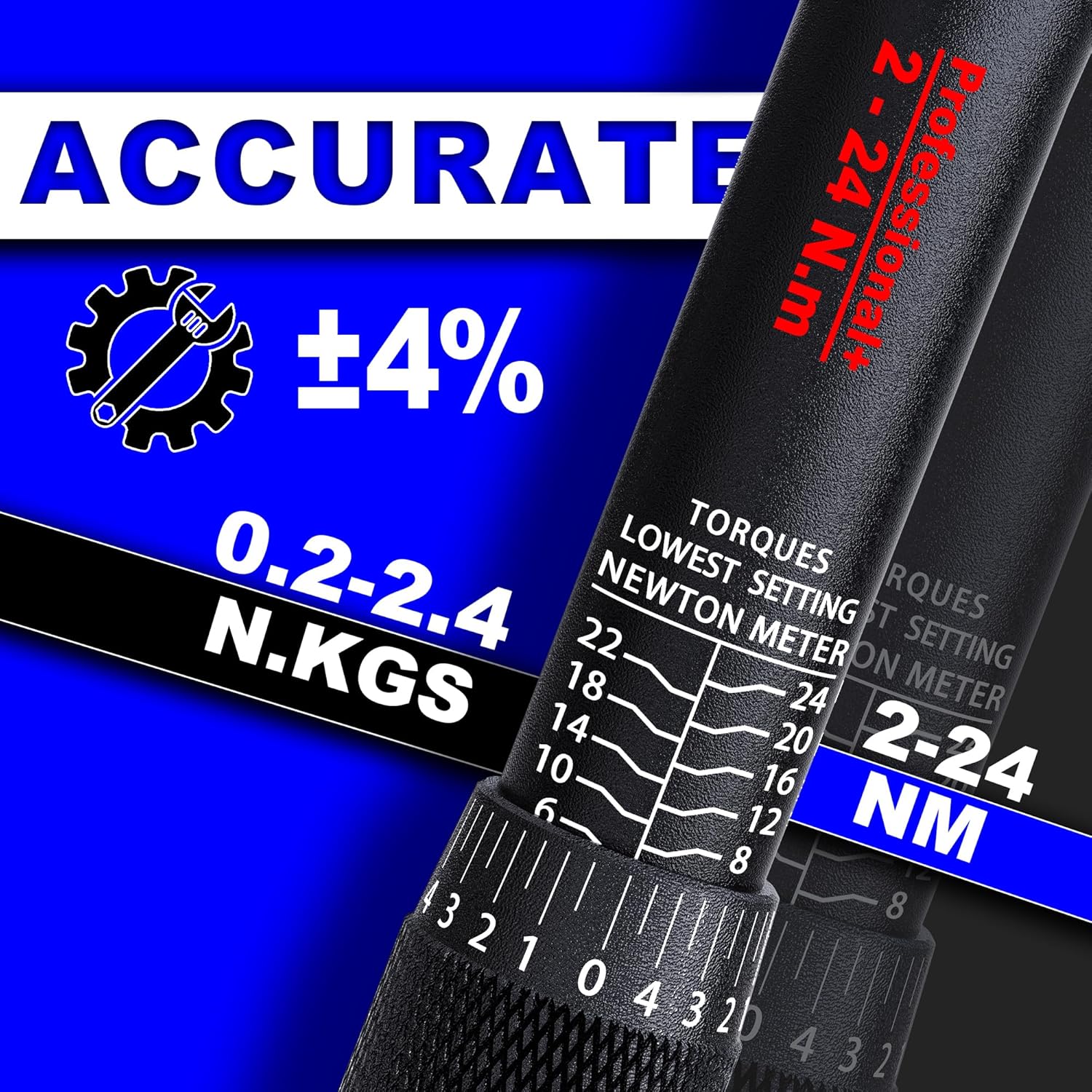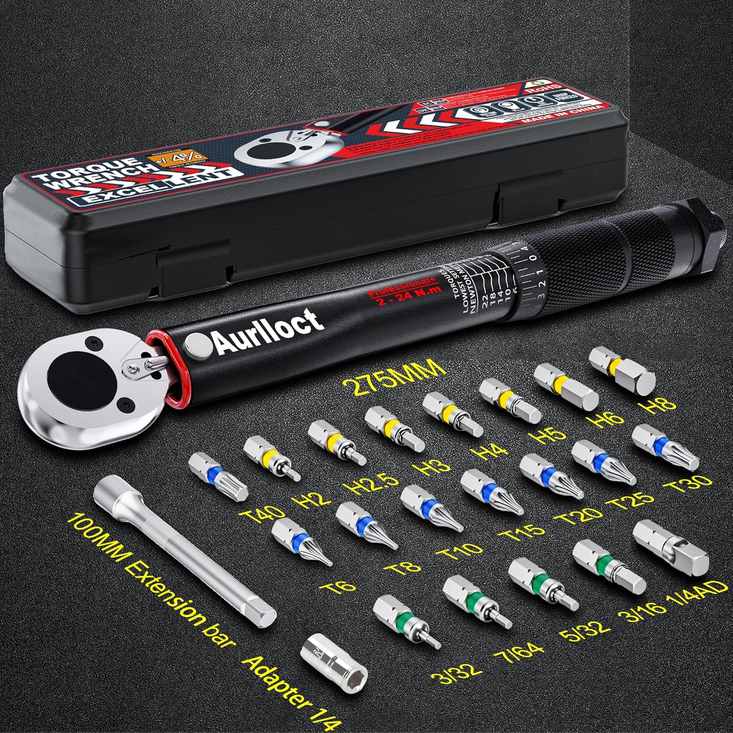 - 23-tlg. Set: Inklusive drehmomentschlüssel 2-24 Nm 1/4 Zoll, Verlängerung 1/4 Zoll mit 10 cm, Adapter mit 1/4"-Aussensechskant auf 1/4"-Aussenvierkant für Steckschlüsseleinsätze, Sechskant-Bits: H2, H2.5, H3, H4, H5, H6, H8, 3/32, 7/64, 5/32, 3/16;