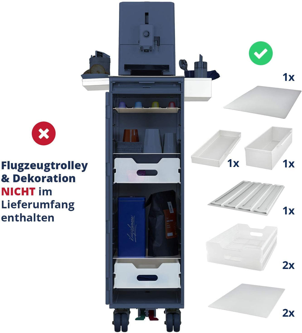 - Lieferumfang: 1x Abdeckplatte, 2x Einschub Kunststoff, 2x Fachboden, 1x Fachboden für Kaffeekapseln, 1x Sidebox 305x30, 1x Sidebox 305x80 (Flugzeugtrolley NICHT im Lieferumfang enthalten)