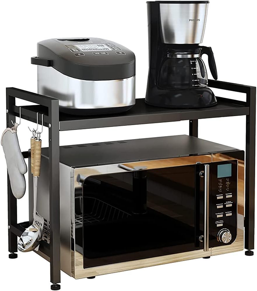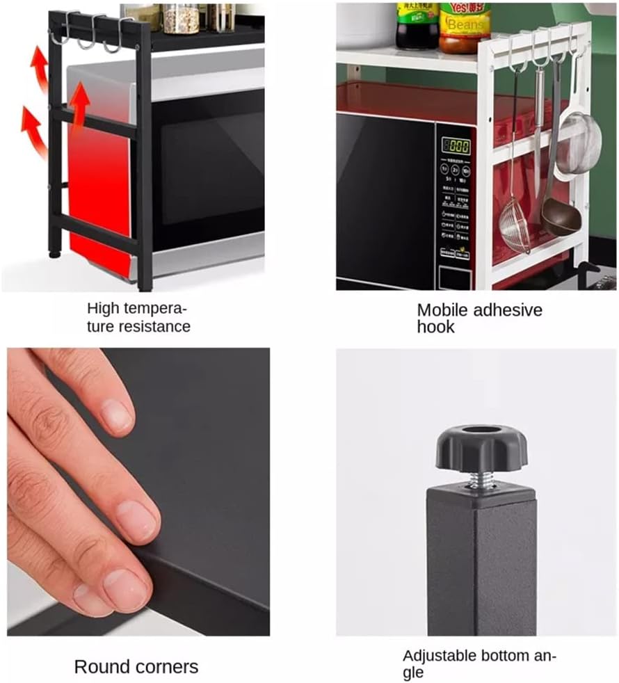 - 【Platzsparend】 Das Mikrowellenregal verfügt über zwei Ebenen Platz zum Aufbewahren von Küchenutensilien und Gewürzen, und 6 Haken zum Aufhängen von Handschuhen, Spatel und anderen wichtigen Küchenutensilien.