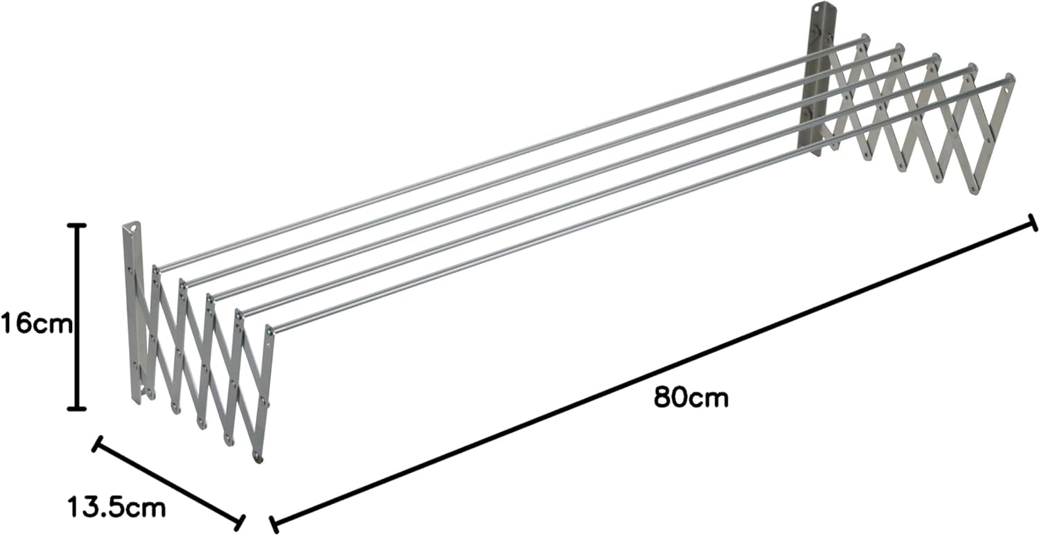 • Ausziehbarer Wand-Wäscheaufhänger mit Haltestreifen und 5 Stäben aus Aluminium von 80 cm Länge.