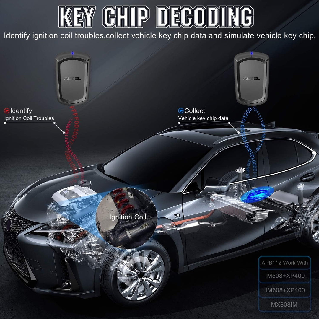 - EY CHIP DECODING: Der Autel APB112 Smart Key Chip Simulator wird verwendet, um die von der Zündspule gesendeten Daten zu erfassen, um die Probleme der Zündspule zu identifizieren und die Daten des Fahrzeugschlüsselchips zu erfassen. Es kann Daten von