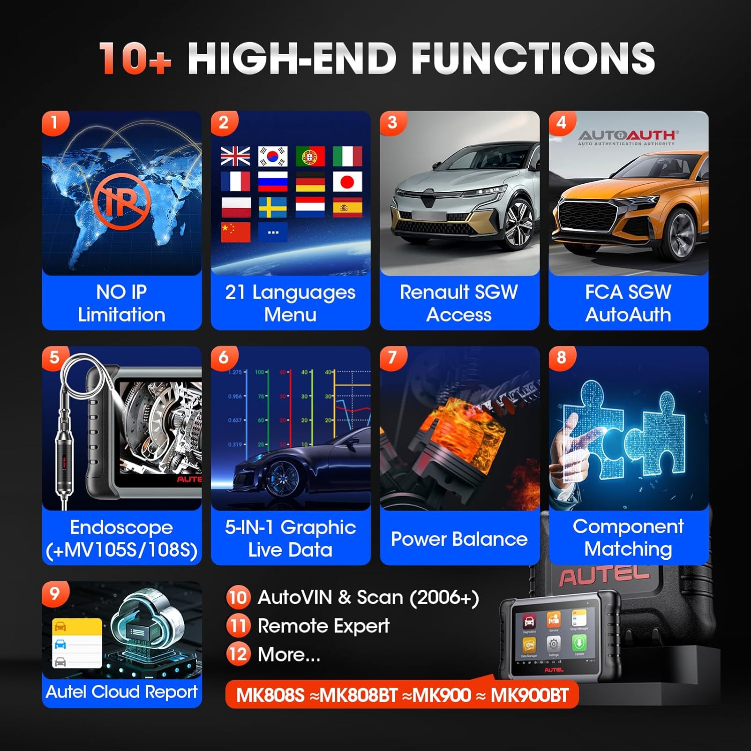 - Vollständige OBD2-Funktionen: Unterstützt alle OBD2-Protokolle und 10 Testmodi, einschliesslich Freeze Frame Enhanced-6-Modus, Fahrzeuginfos, I/M Readiness, On-Board Monitor und Bauteiltests.