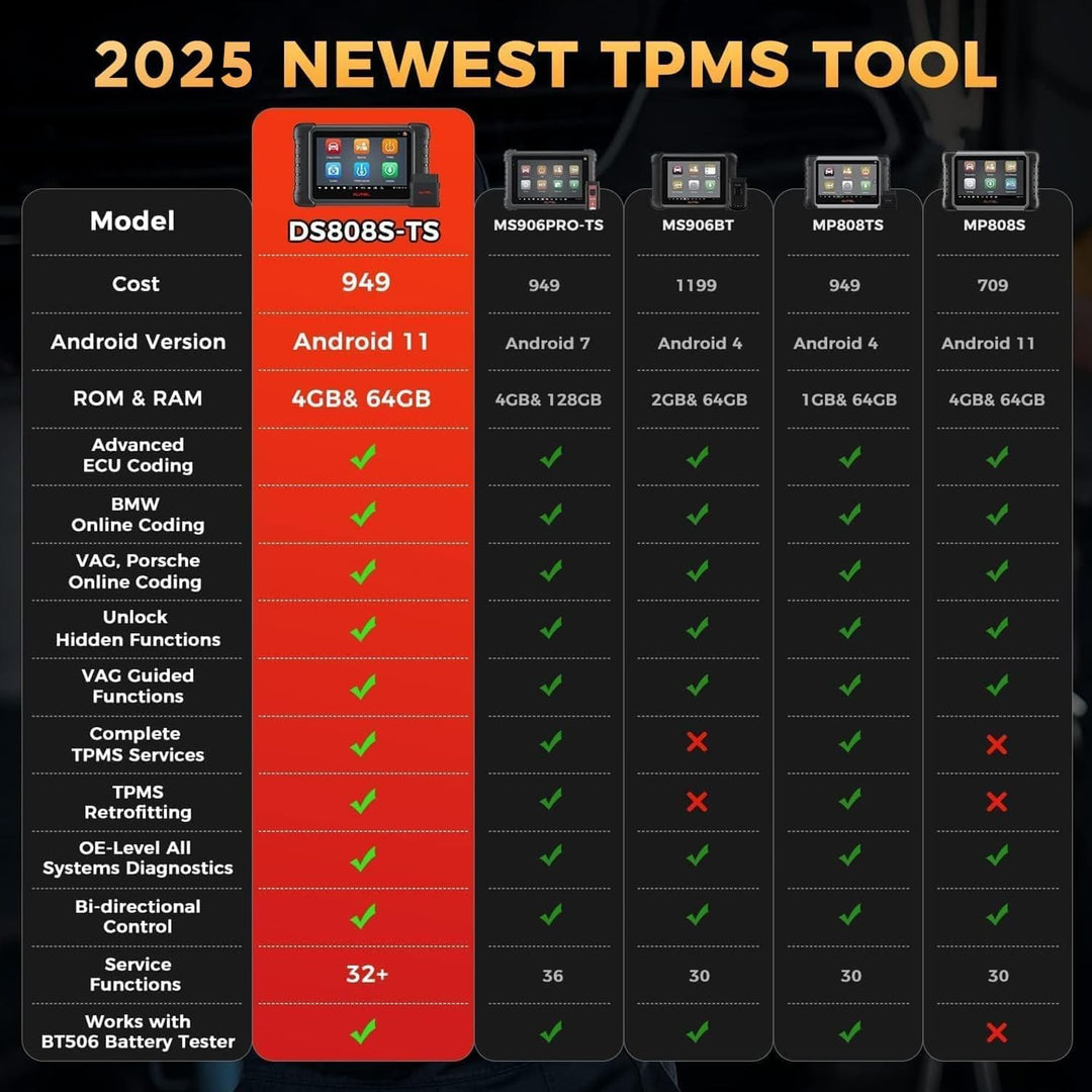 - đăTPMS-DIENSTE AUF PROFI-EBENE, GLEICH WIE MS906TS/MS906PRO-TS/MK906PRO-TSăAutel DS808S-TS ist aktualisierte Version von DS808/MP808S, da es mit OE-Diagnose fĂŒr Alle Systeme und vollstĂ€ndigen TPMS-Diensten hinzugefĂŒgt wurde. Autel DS808S-TS